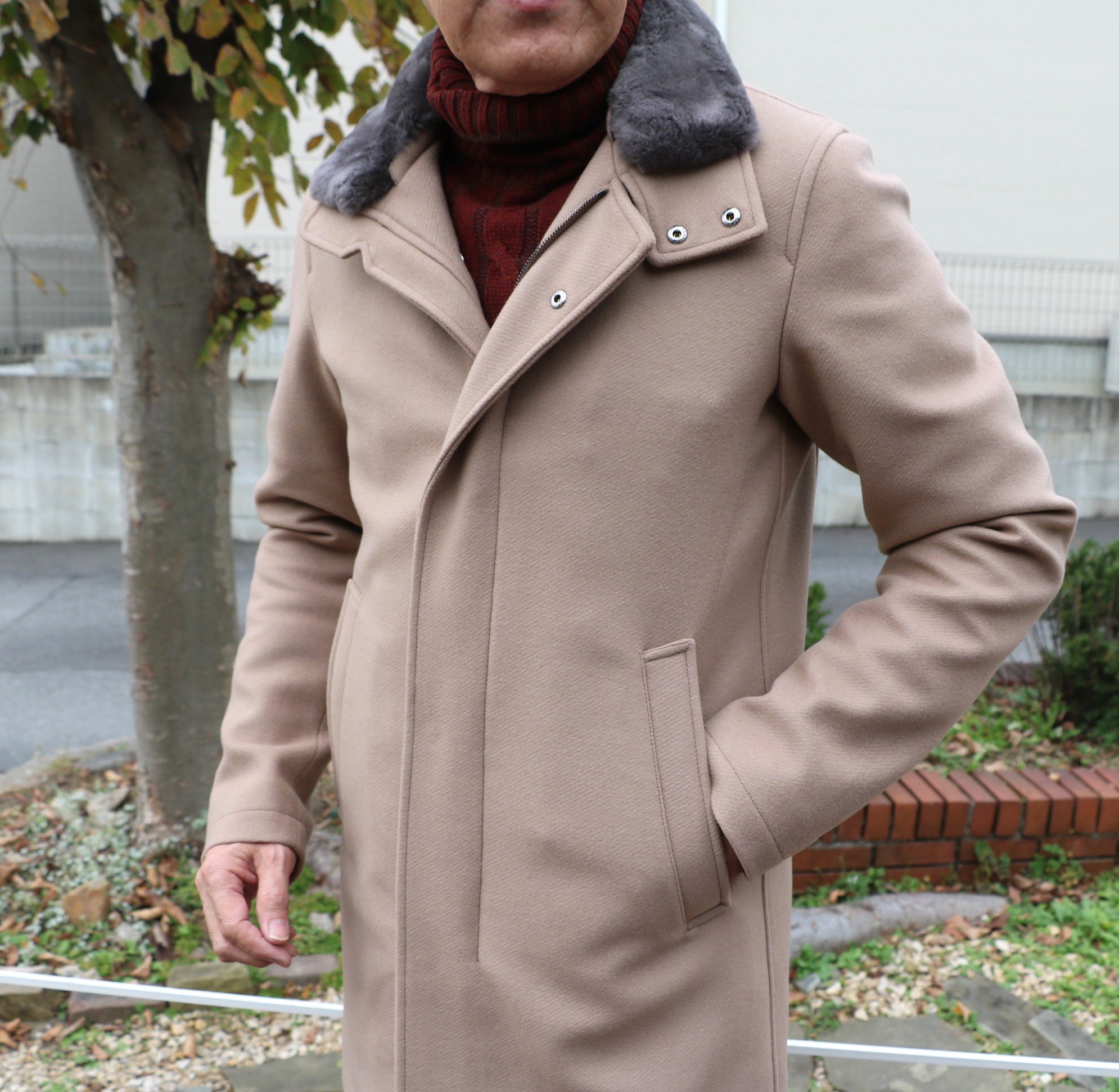 基本的にはバルカラーコートですが、小振りの襟はスタンドカラーのように着こなすのが個人的なおすすめです。また、襟を深く折り返せばチェスターコートにも見え、自由自在な着こなしが楽しめます。