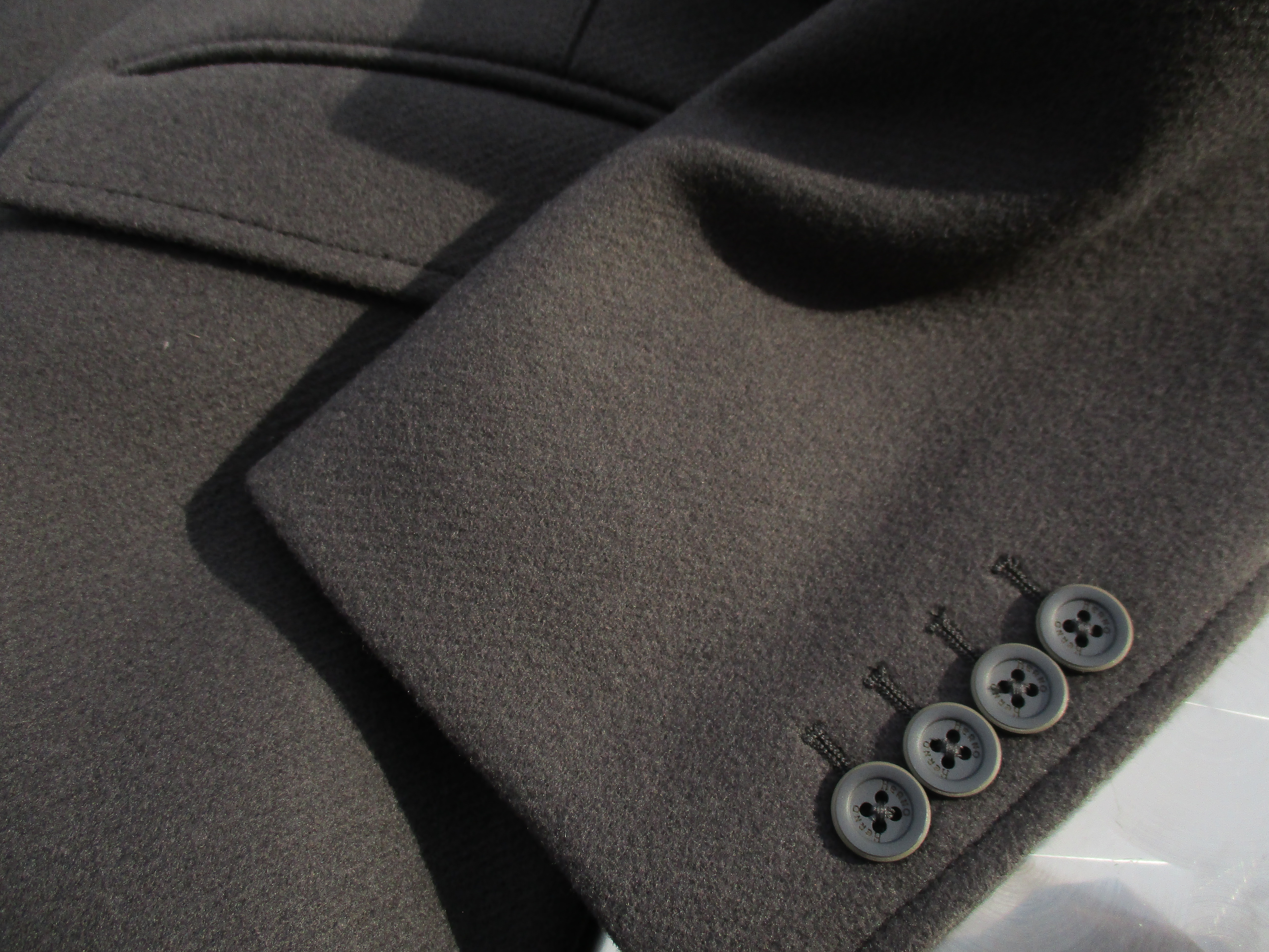 と、タカイの説明文をそのまま引用しましたが、補足するとすれば、袖口にジャケットと同じように4つ釦が付きます。また、説明要らずの襟裏のさり気ないロゴ。これ見よがしなブランドにはないエレガントさが漂うコートです。