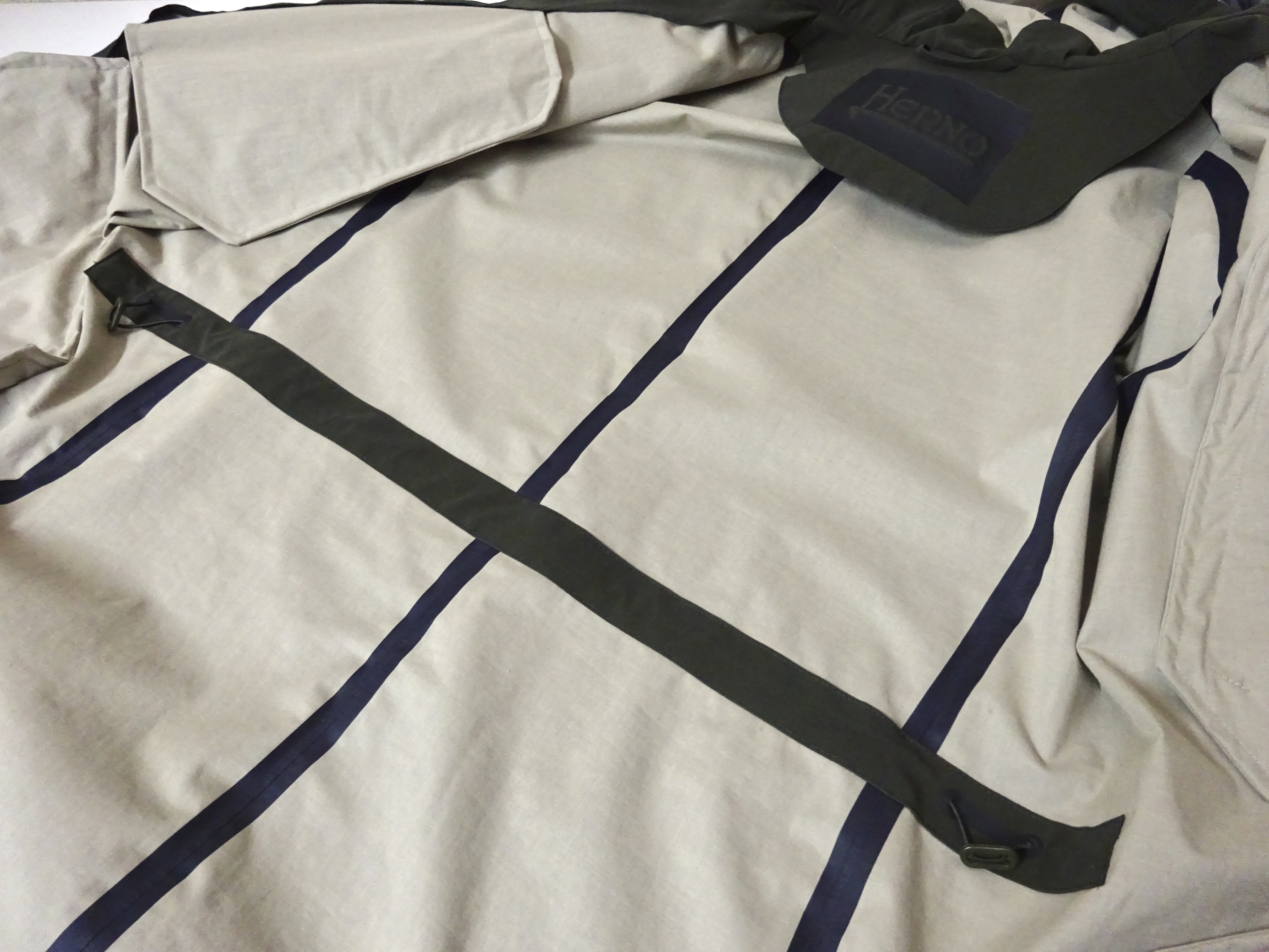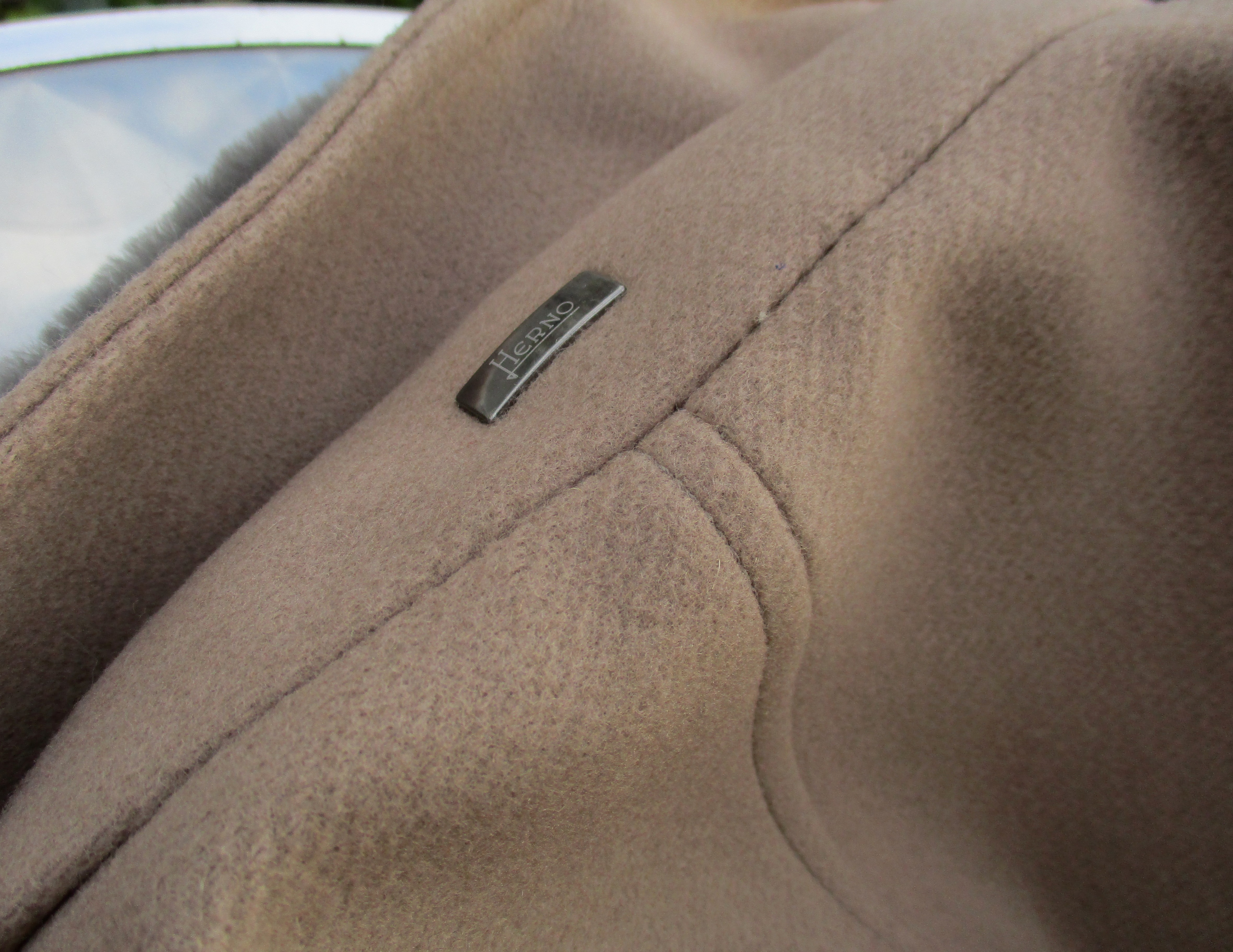 さり気なく付いたのは、取り外し付きのビーバーファー。マフラー要らずの温かさです。付く事で襟元の汚れも気になりません。くどいようですが、襟裏のロゴ。昨年、あるホテルのバーで、クロークルームを覗いたら、このロゴのコートが大半。レディースが多かったのですが、まさかヘルノジャパンの皆さんの二次会?なんて、思うほどでした。
