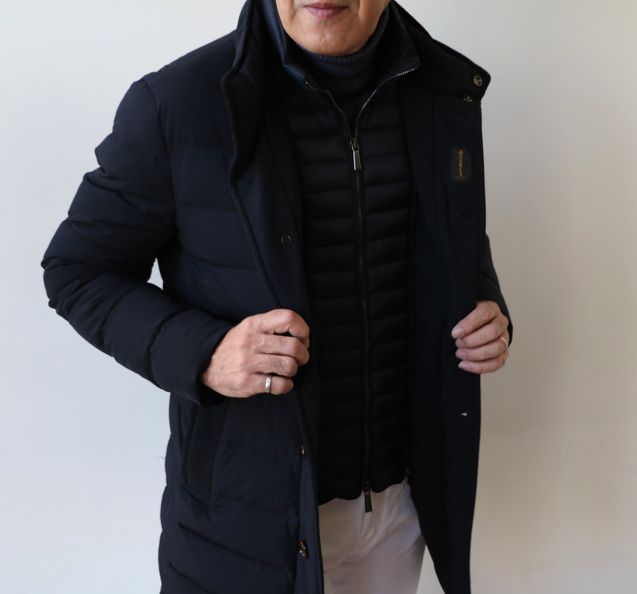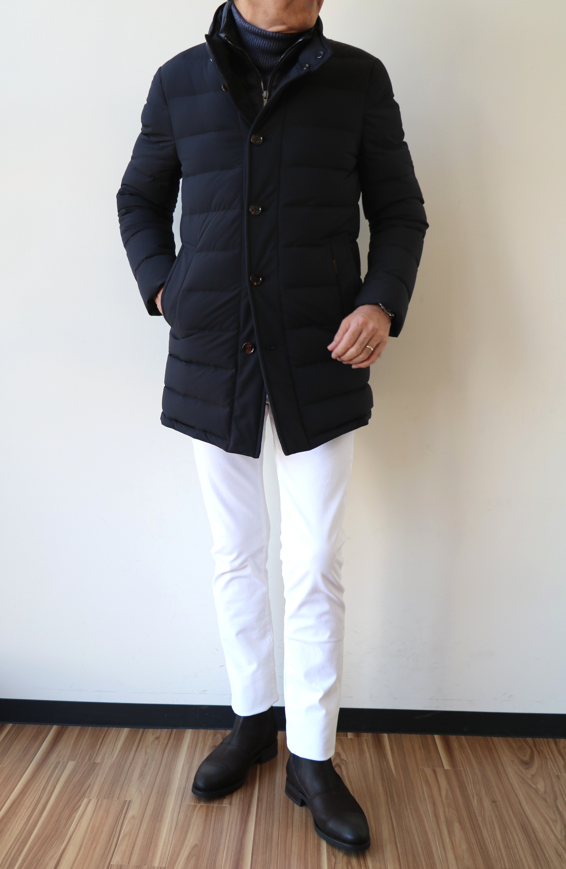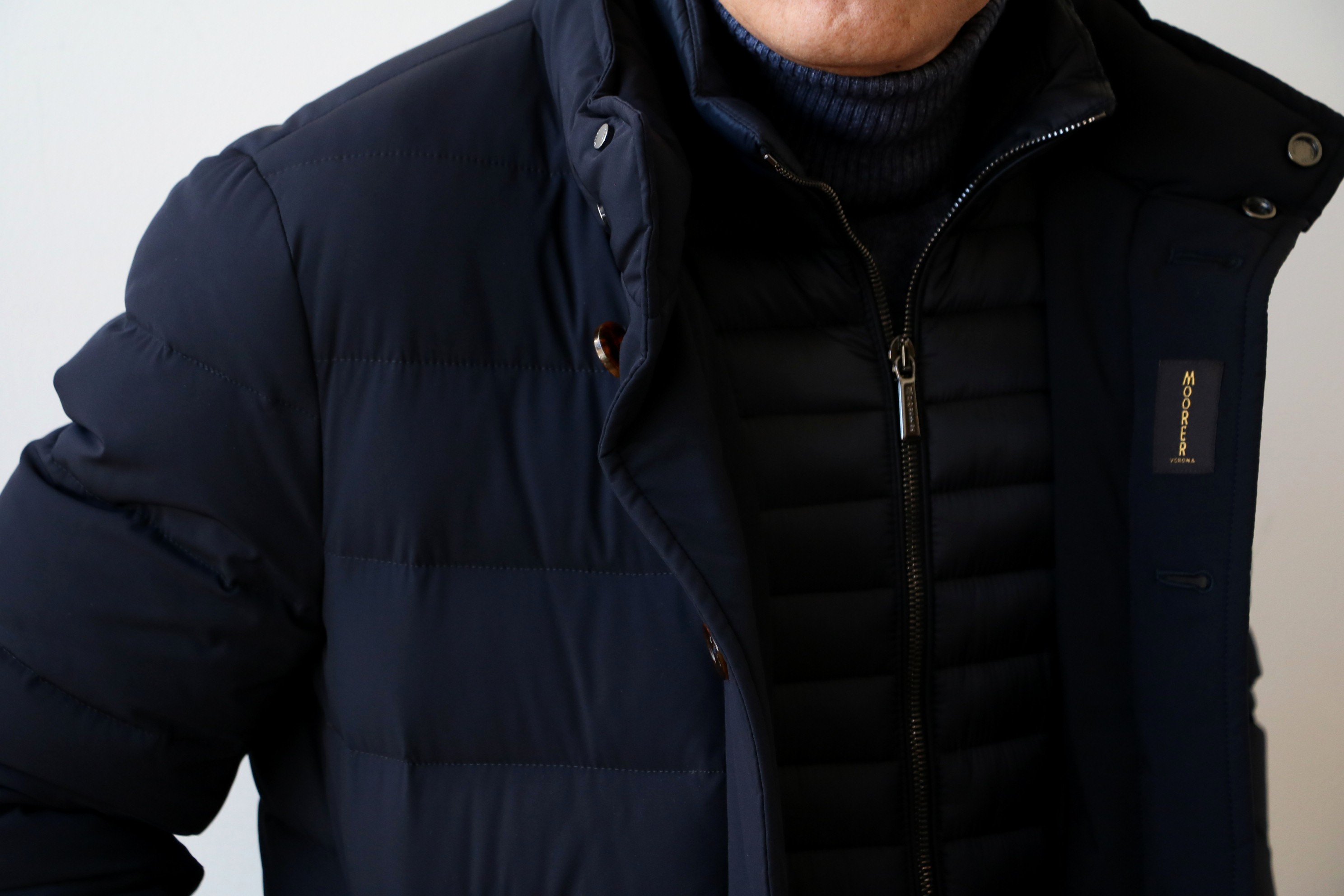 カラーは、ブラックに近いダークブルーです。カジュアルシーンで着る機会の多いショート丈の「VINCI-KN」は、トープ(ASFARTO)を。着丈の長いダウンコート「CAREGARI」は、オンの着用を考慮し、引き締まったダークブルーを選んでおります。フロントのレイヤード仕様は、温度調整としての役割はもちろん、全体のフォルムのアクセントにもなっいます。春先になれば、取り外して、シンプルなデザインを楽しまれても良いでしょうね。