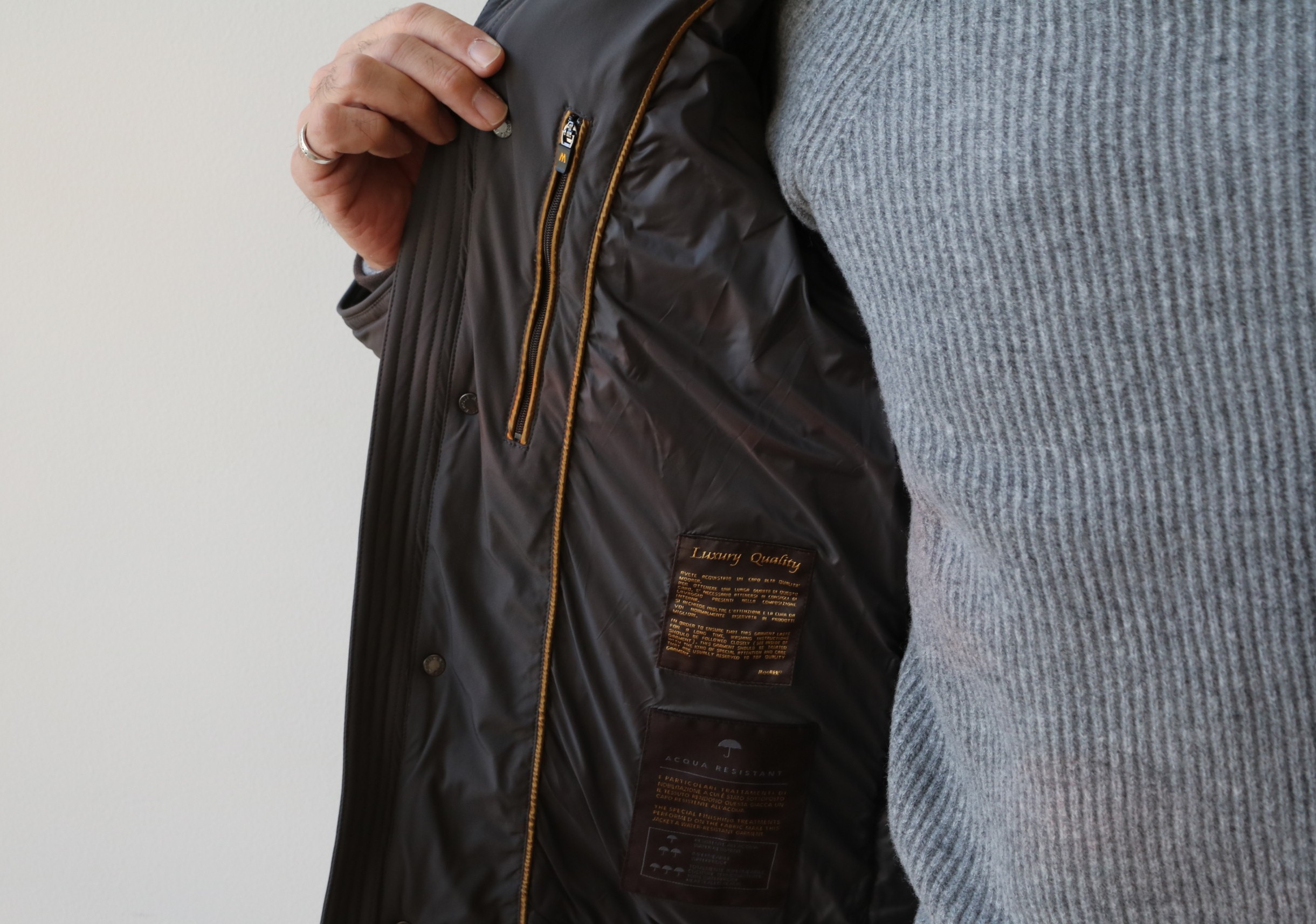 釦、ジップ、パイピングや裏地など、全てのパーツが美しい【MooRER/ムーレー】。ブランドロゴが前面に出ていなくても、存在感は抜群です。ロゴに頼らない、妥協を許さない物作りに多くのファンが魅了されています。