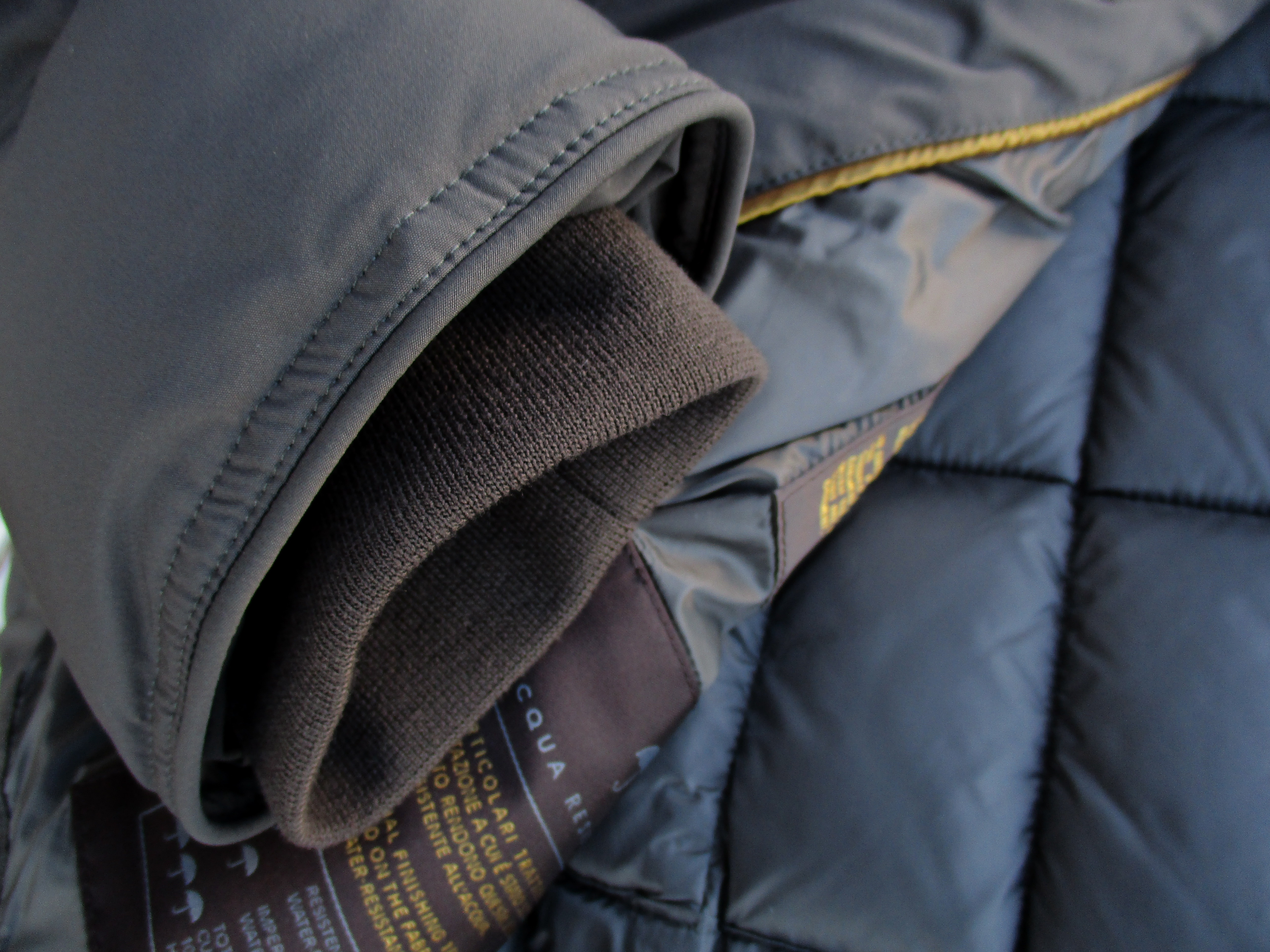 表面の素材はポリエステル100%。斜めに織り目が入るサージ生地は丈夫で撥水性があり、古くからレインコートに使われています。