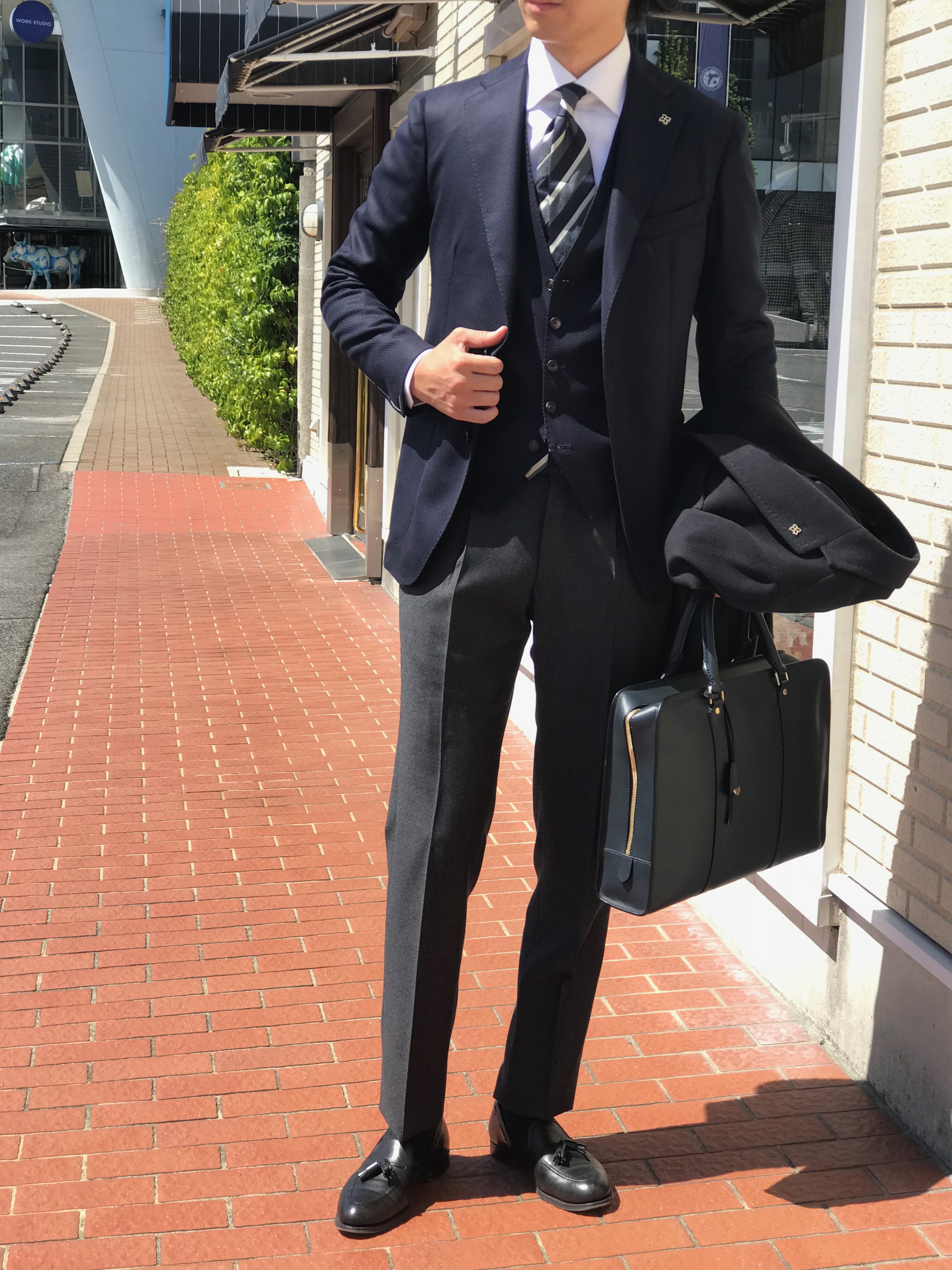 ネイビーに合わせたジャケットとジレはTAGLIATORE、ネクタイはHolliday&Brown、パンツはINCOTEX、バッグはBoldrini SELLERIA、シューズはCROCKETT&JONESです。チャコールグレイに合わせたニットはSettefili Cashmere、パンツはRICHARD J.BROWN、バッグはBoldrini SELLERIAです。