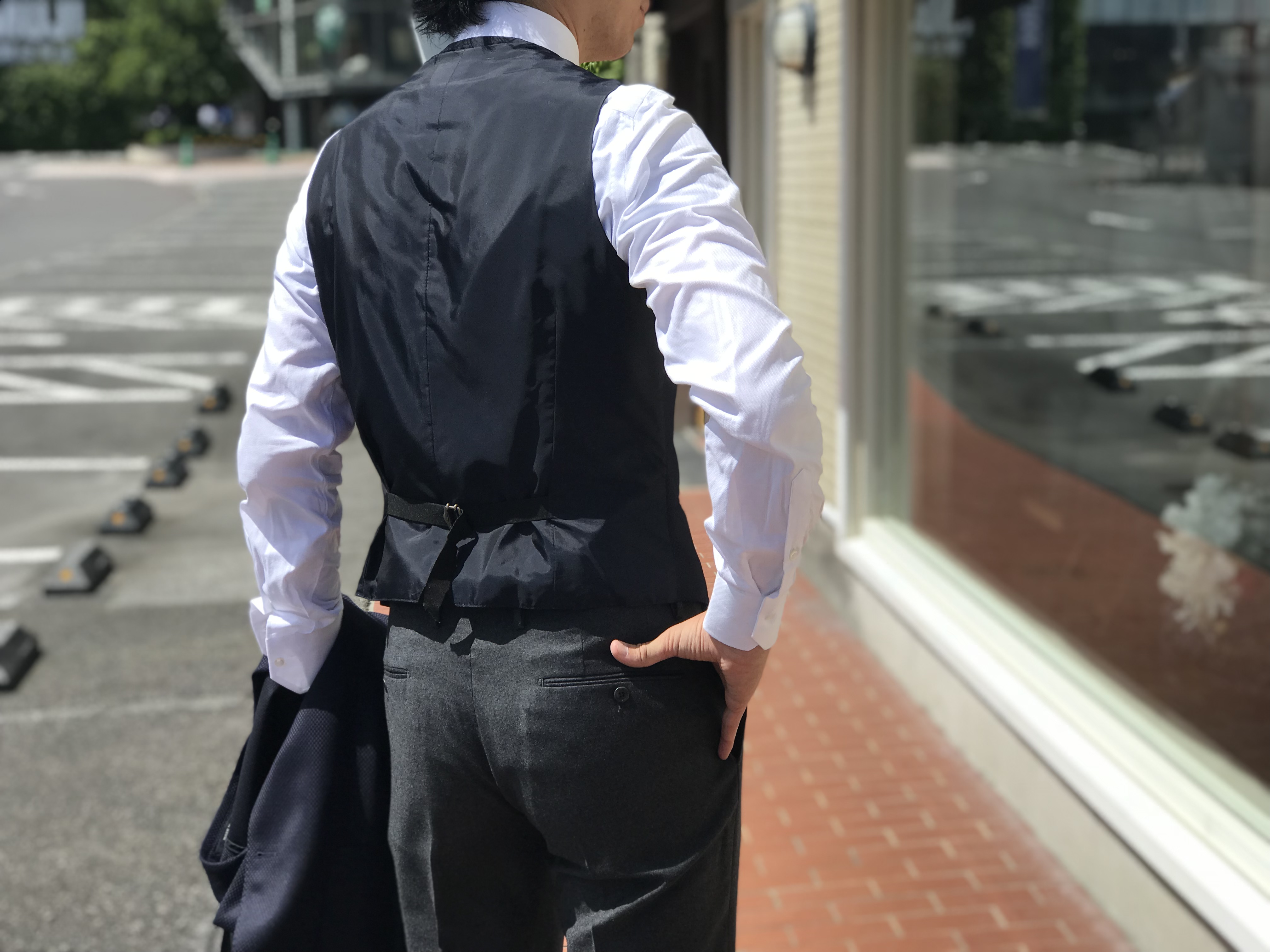 共地で揃えたジレは、別ジャケットとの組み合わせもしやすく、これ一枚持っていれば多彩なコーディネートを楽しめるでしょう。さらに、うしろ姿が決まるジレスタイルは、ジャケットがなくともサマになりますね。