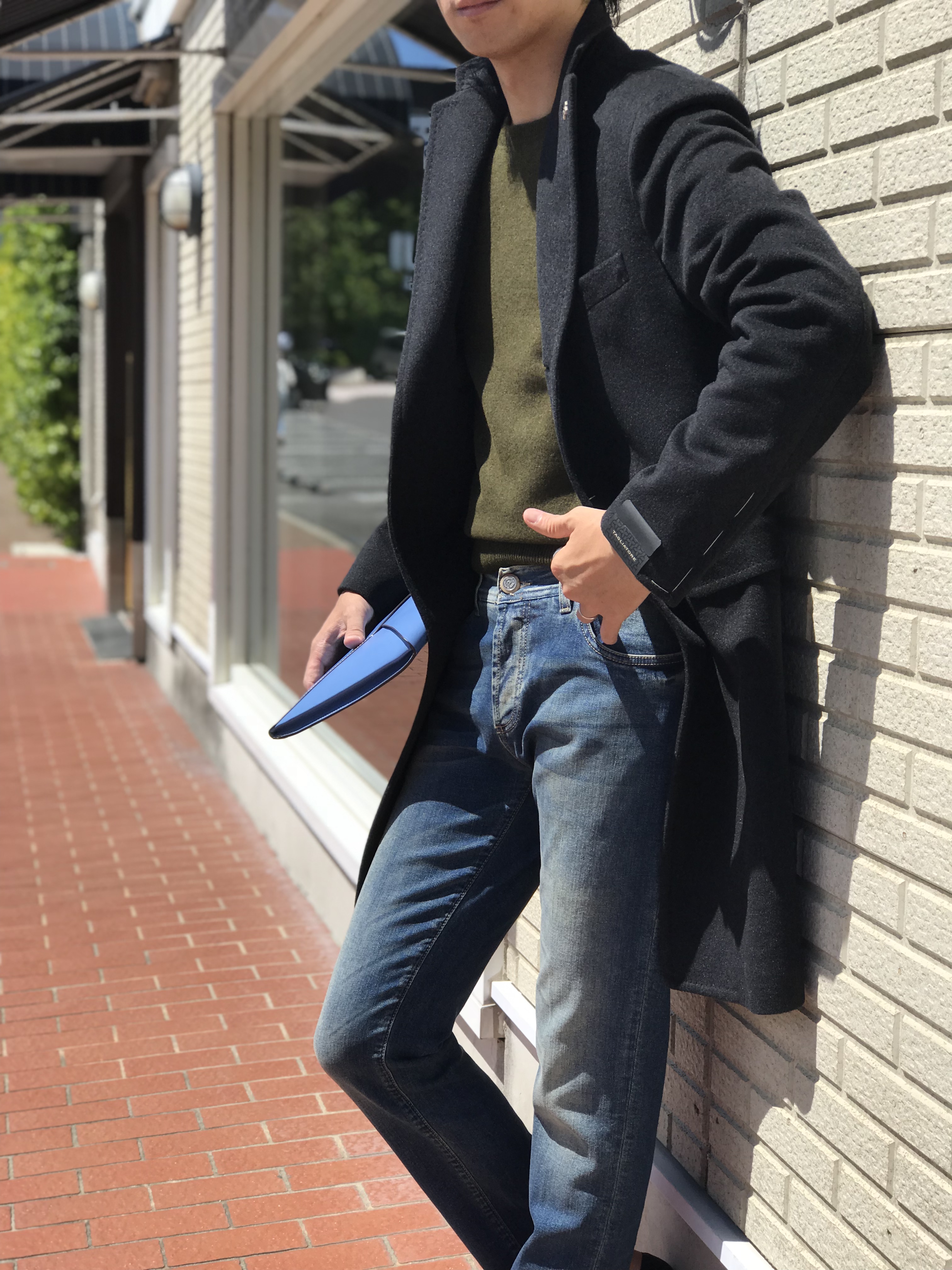 モデルは身長180㎝、体重67㎏、胸囲93㎝で、サイズ46を着用しております。合わせたニットはJOHN SMEDLEY、パンツはRICHARD J.BROWN、マフラーはJOHNSTONS、バッグはBoldrini SELLERIAです。