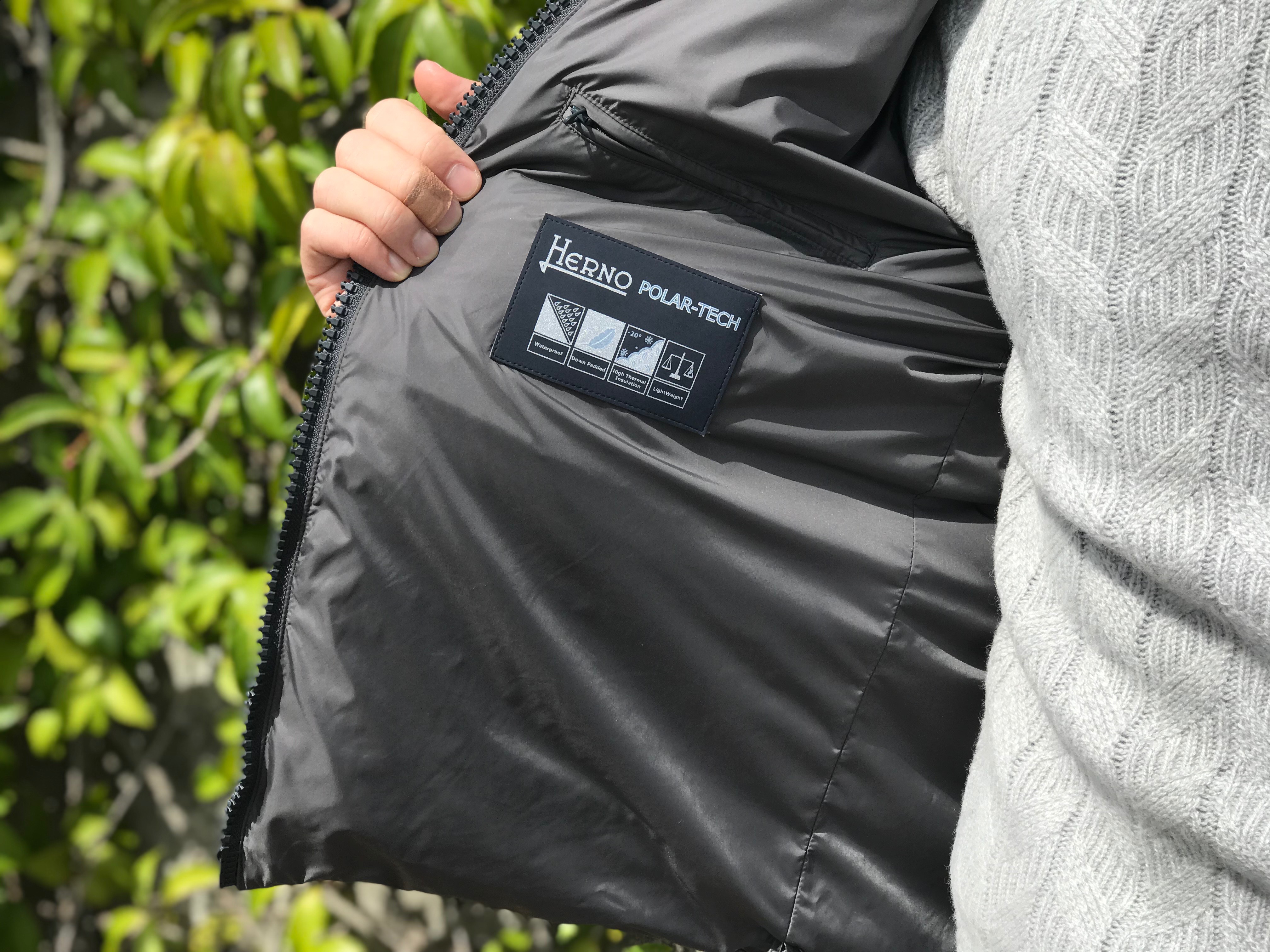 機能素材の「HERNO IN TECH」は、表面にウォータープルーフ(撥水)加工が施された生地に、雪が降る状況下でも内側の温度を保ち続けるチルプルーフ機能を備えます。そして、生地が呼吸するかのように湿気を吐き出して、快適な着心地を与えてくれます。