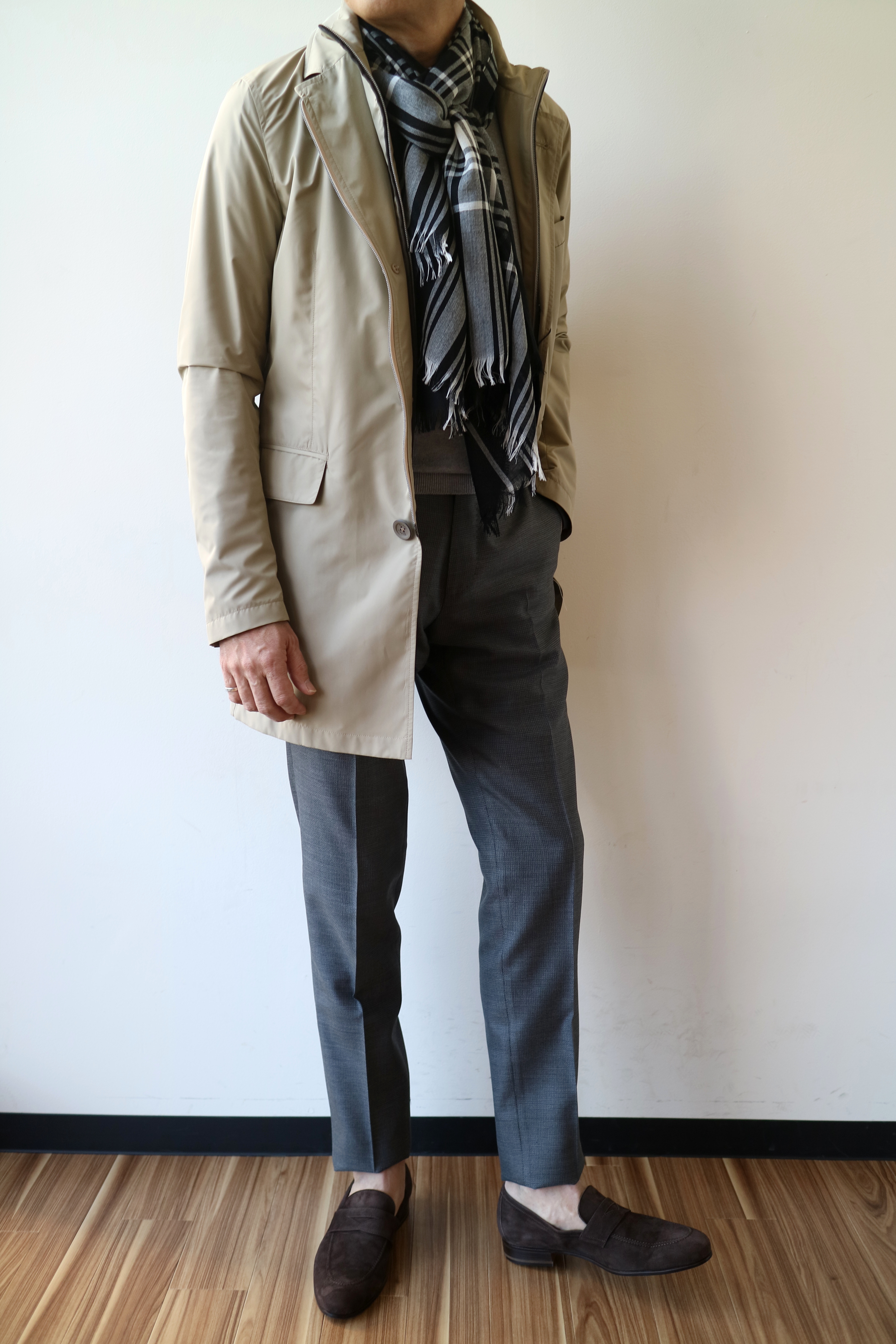 合わせたニットはZANONE(ザノーネ)、パンツはINCOTEX(インコテックス)、ストールは未公開のJOHNSTONS(ジョンストンズ)です。