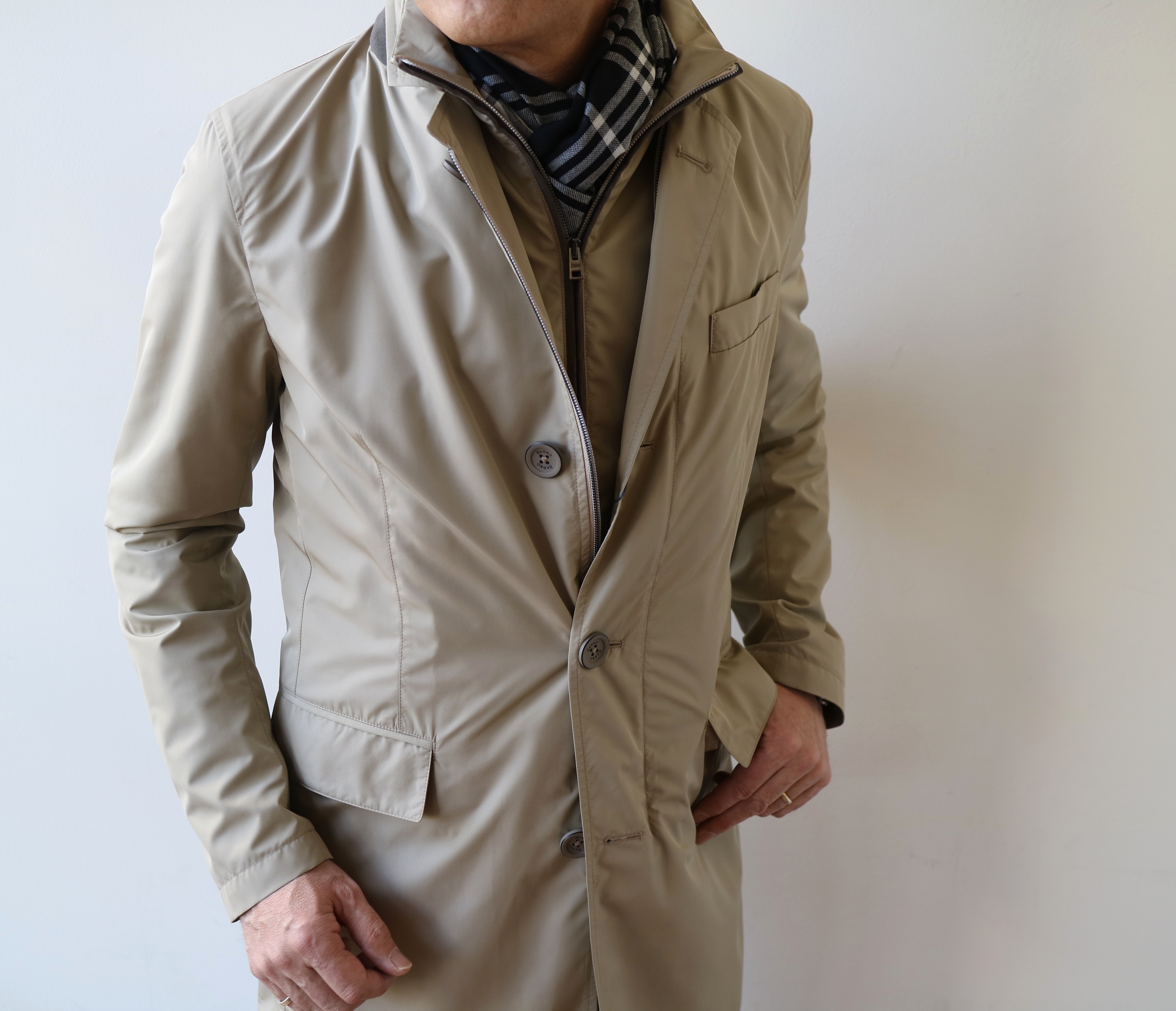 【HERNO/ヘルノ】の原点ともいえる「Rain Collection」。ビジネスコートとして活躍するシンプルなデザインは、カジュアルシーンにも欲張りに使いたいものです。
