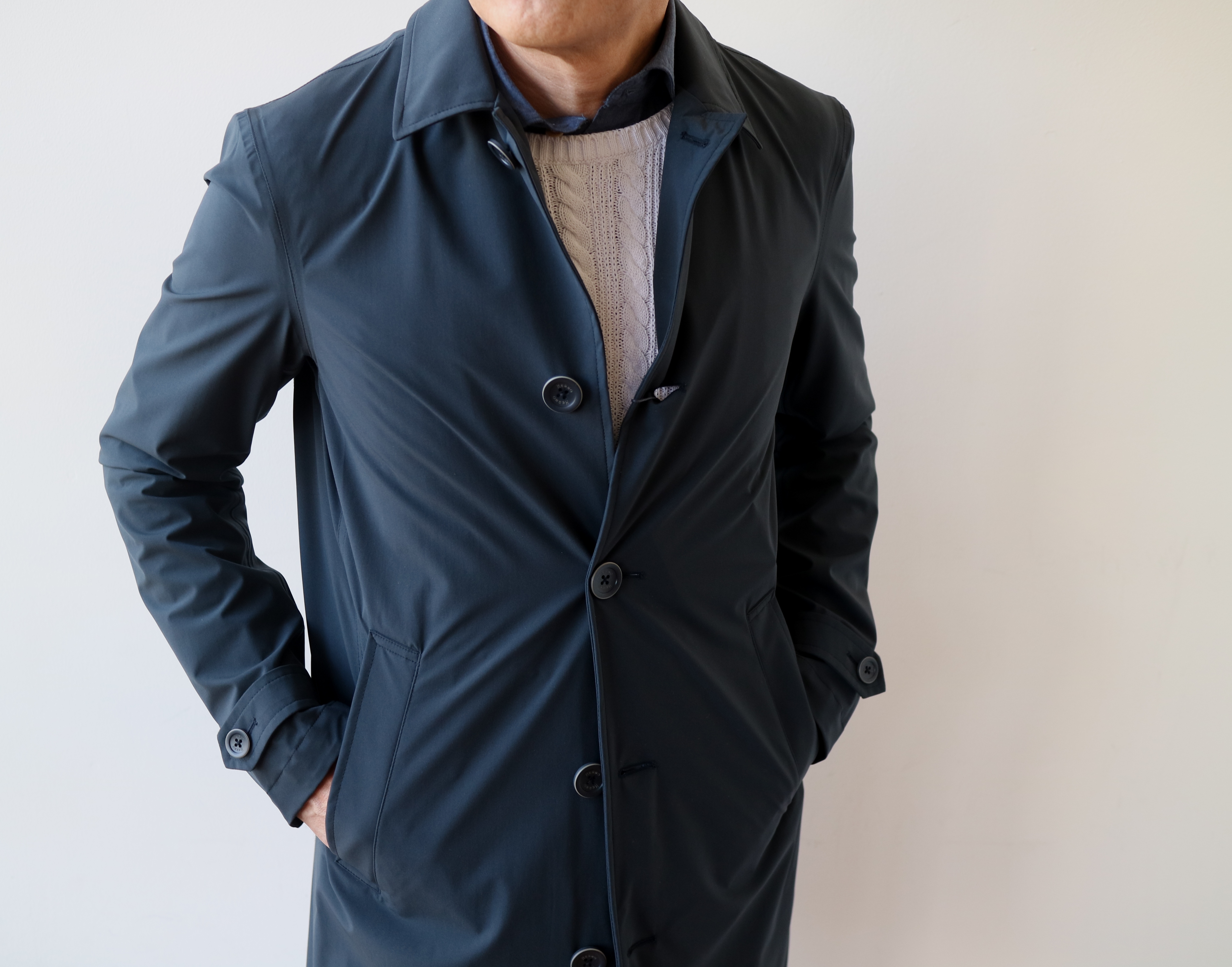機能性抜群の「3LAYER STRECH」シリーズもオンオフと幅広いシーンで使っていただけます。風、雨、埃から身を守ってくれる春のコートは頼もしい存在です。