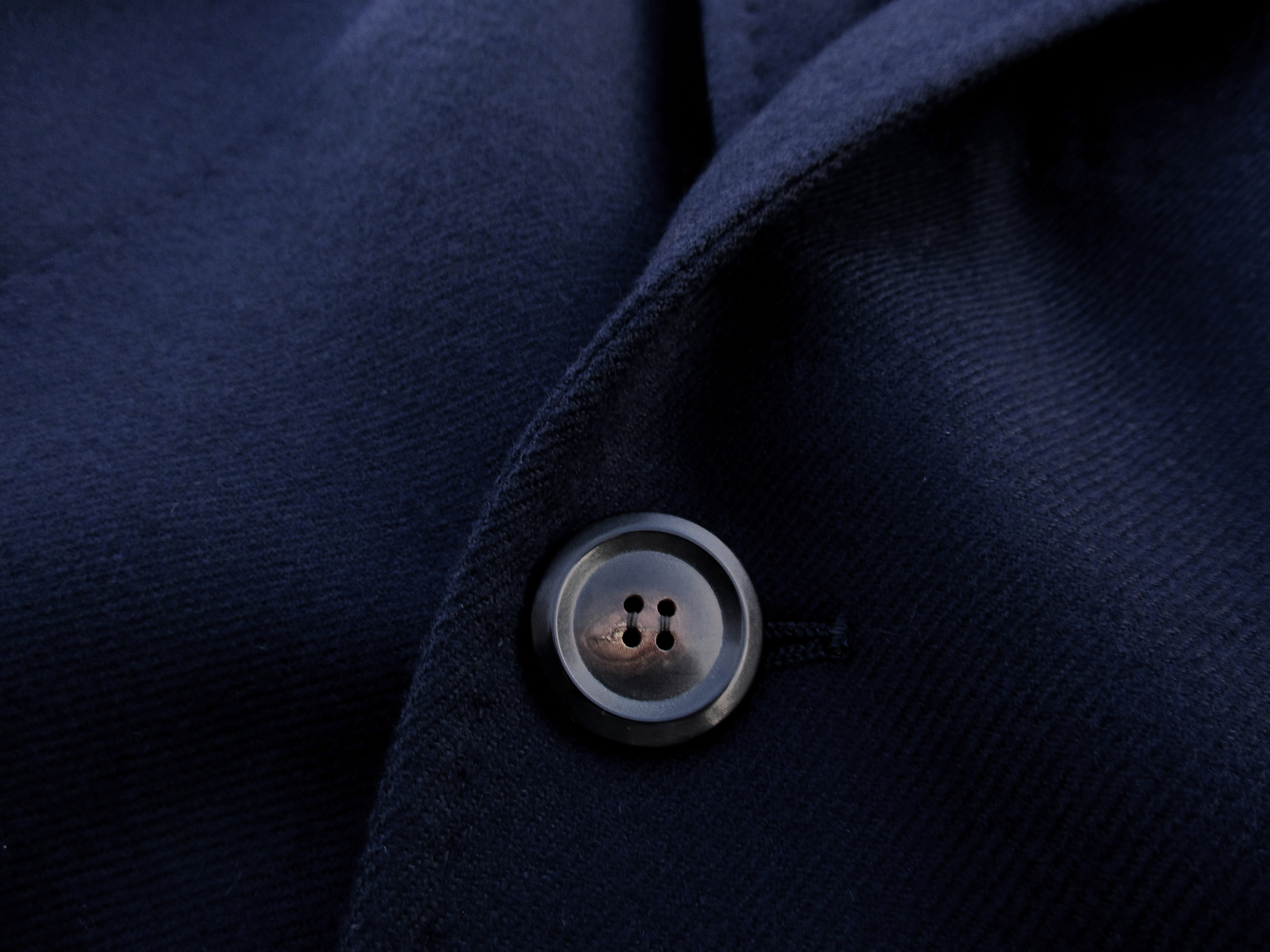 先にご案内のダブルベルテッドコートに比べると、キメの細かい綾織りです。素材もカシミア1%入るだけで、美しい光沢を放ちます。シンプルだけで優美なコートに仕上がっています。