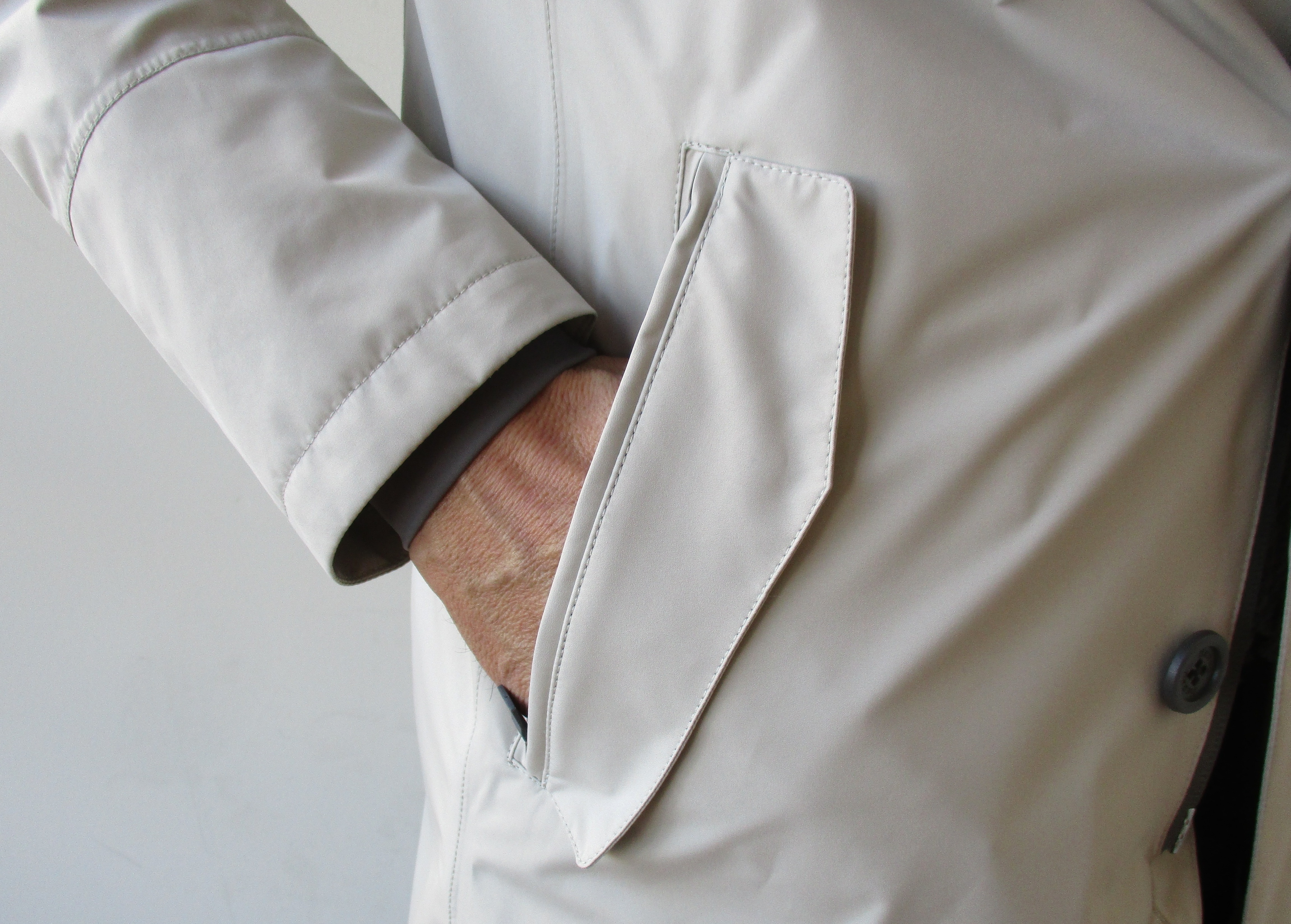 フロントは止水ジップと釦の二重構造です。チェスター型といえどもジップを上がれば、立ち襟のコートになります。袖口にも風の侵入を防ぐためのリブ仕様。締め付け感のない優しい配慮です。サイドのポケットは止水ジップ付き。スナップ留めされているフラップは飾りになります。