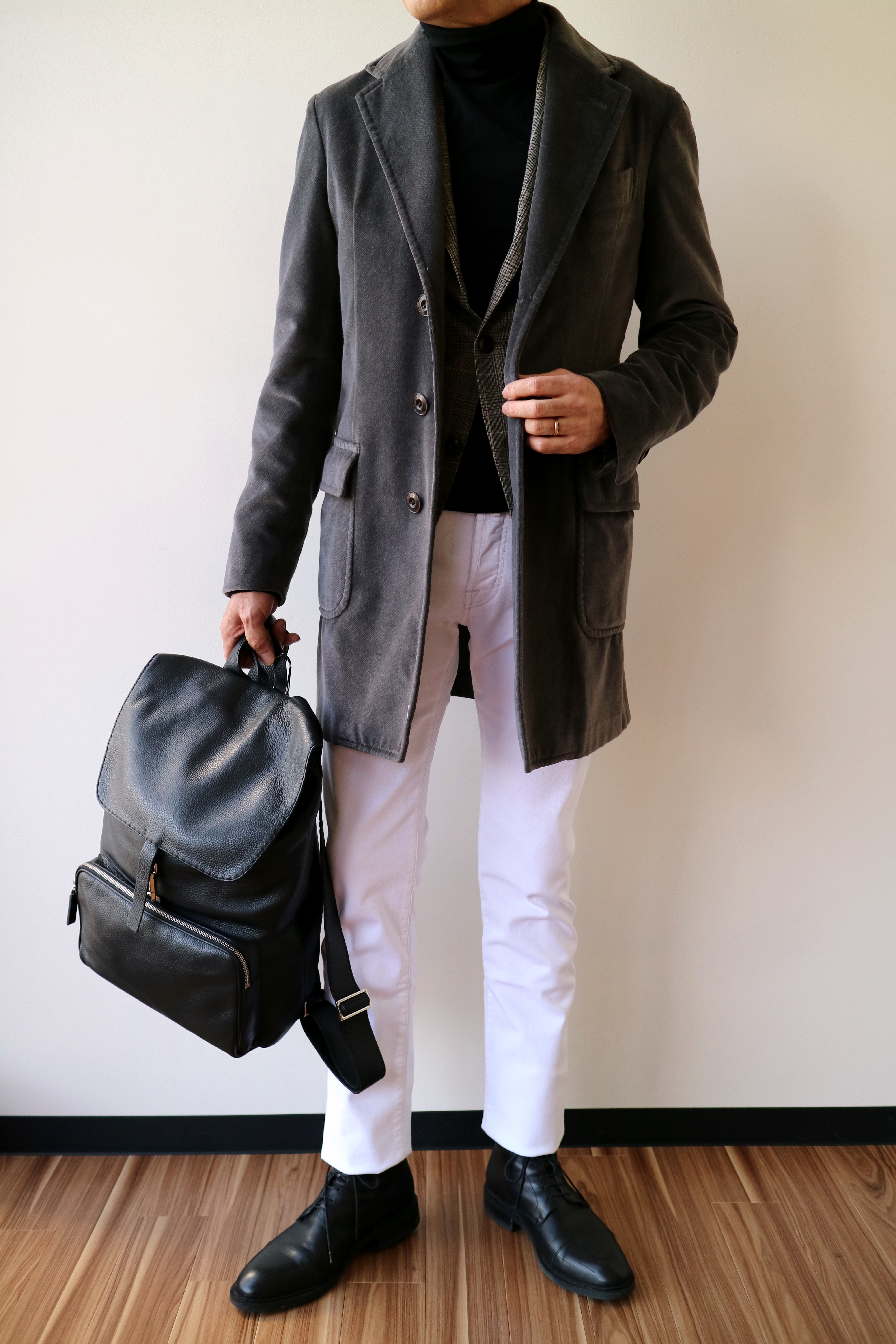Gran SassoのタートルニットとCare label(マガジーノ展開中)のホワイトデニムに羽織ってみました。手に持ったバッグはZANELLATO、ベルトはTIBERIO FERRETTI、靴はParabootです。