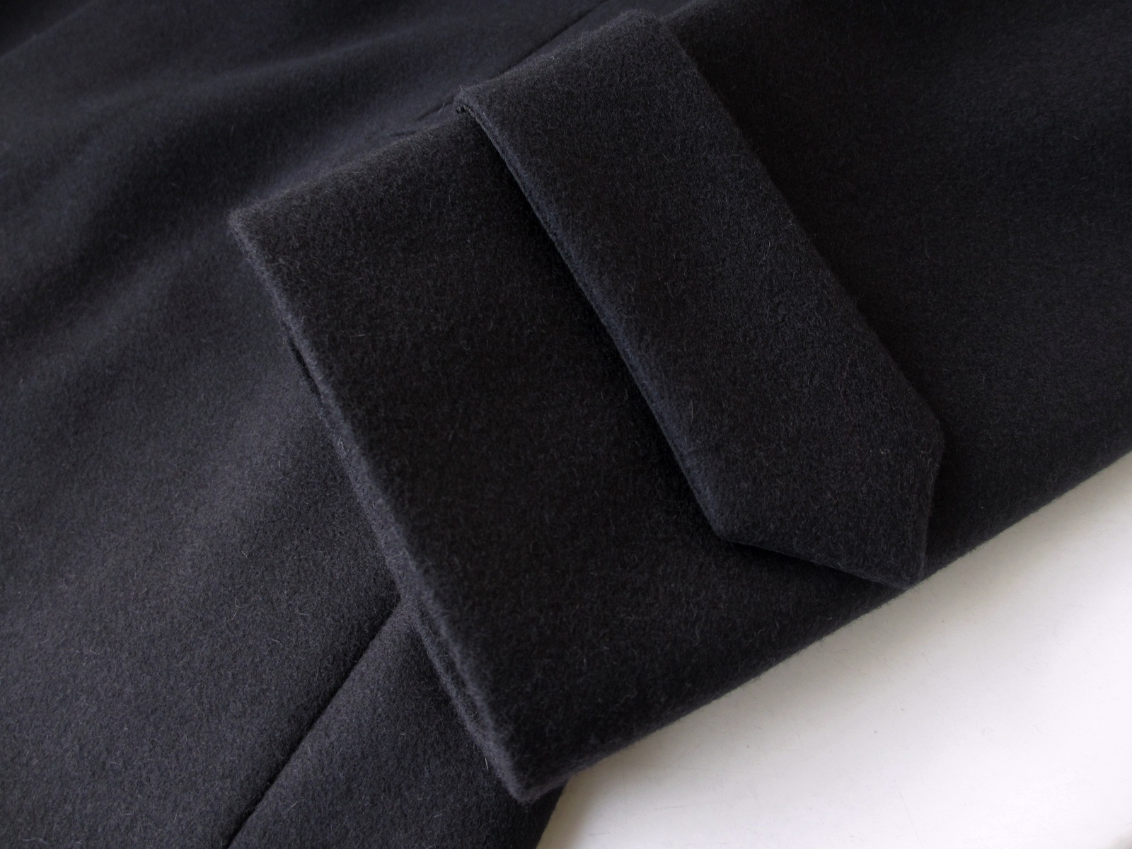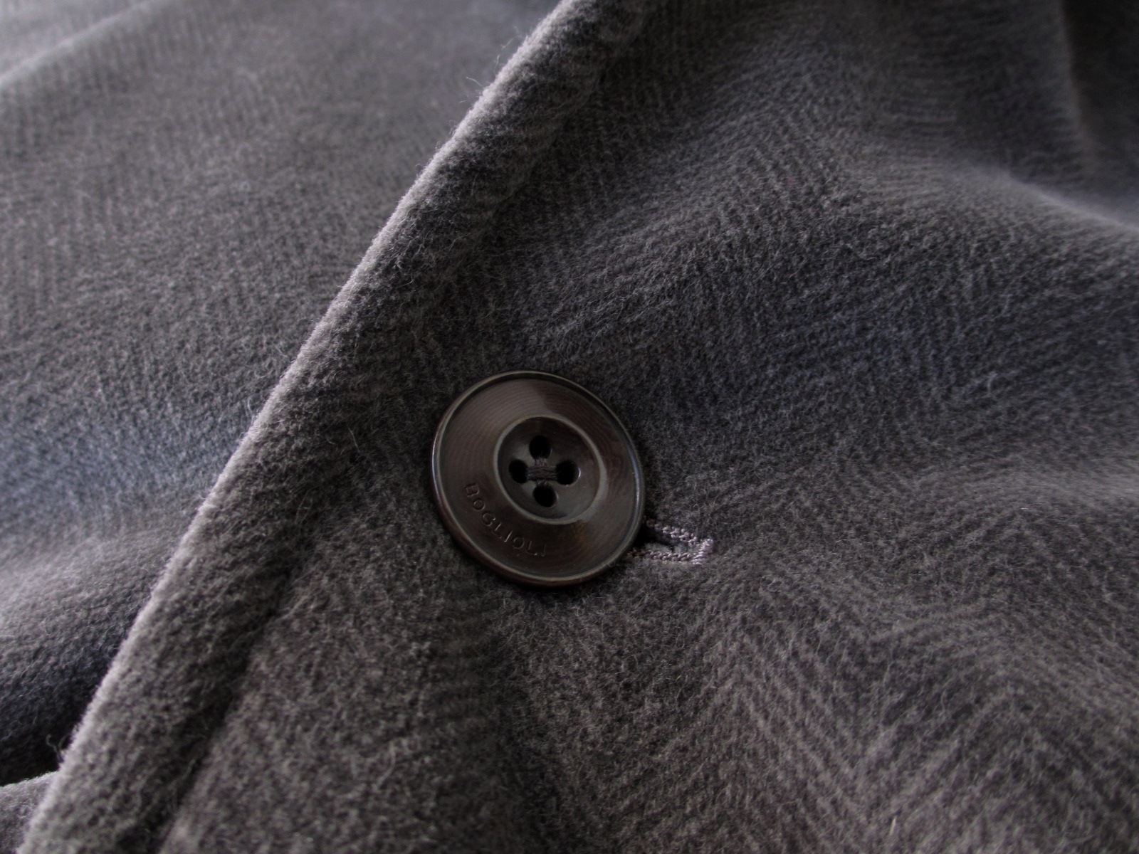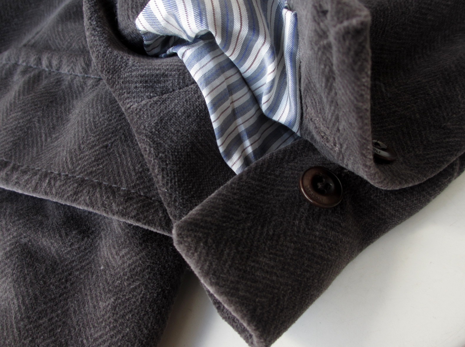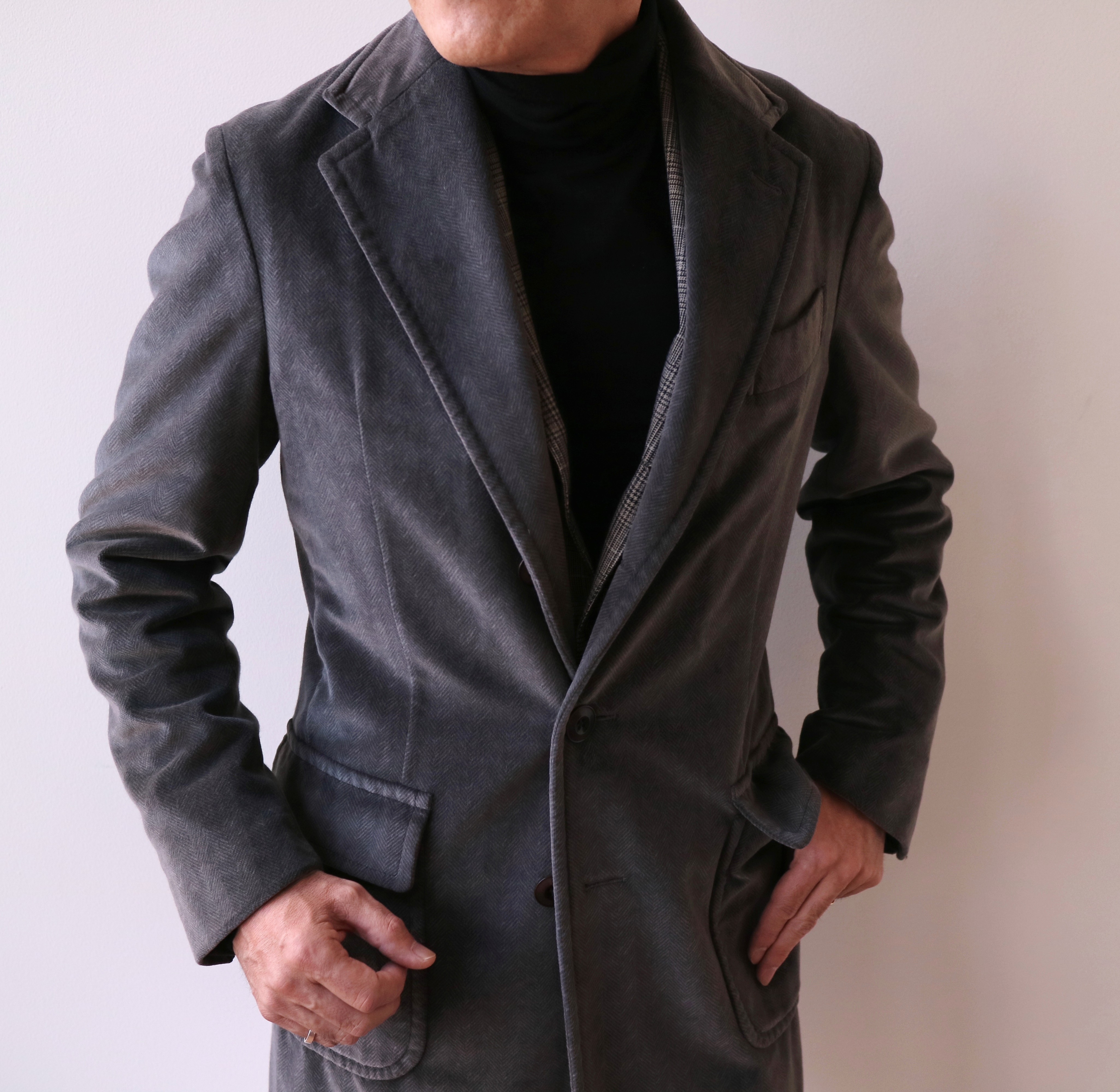 コットン100%の別珍素材は、モダンなヘリンボーン柄で。セピアがかったグレイの色合いが、どこか懐かしさを感じさせてくれる、そんなコートに仕上げています。袖口は3つのくっつけ釦で本切羽になっています。ツメる場合は肩からになります。