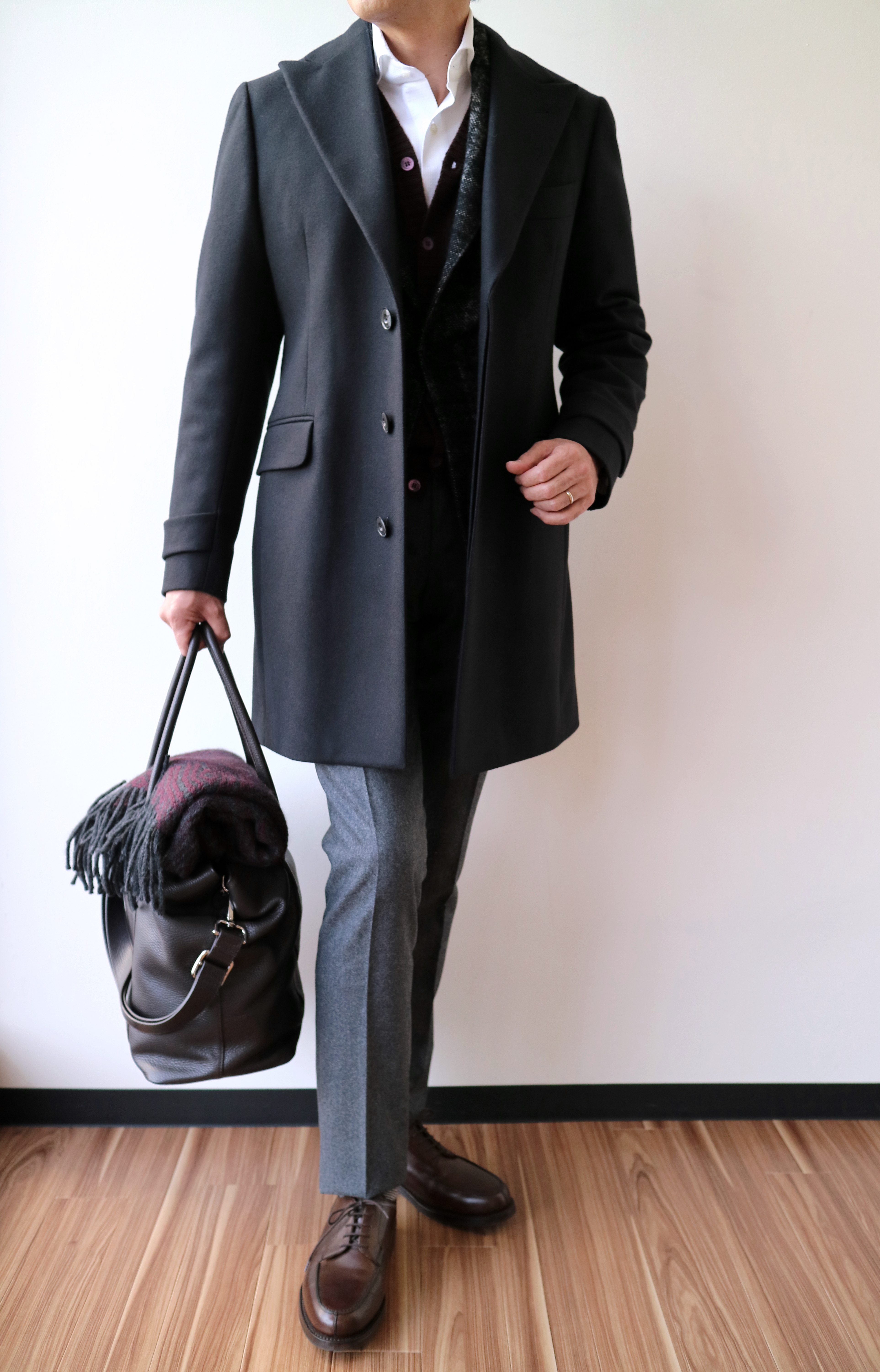 来週からスタートする2016年秋冬のプレコレクション。一泊二日の出張をイメージしてコーディネートです。天気の変わりやすい季節だけに、脱ぎ着のできる重ね着は必須です。
