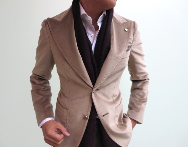 モデルは身長175㎝、体重63㎏、胸囲91㎝でサイズ44を着ております。合わせたシャツはBARBAの「CULTO」、ストールはALTEA、ベルトはWilliam、パンツはPT01(未公開)、靴はDOUCAL'S(私物)です。