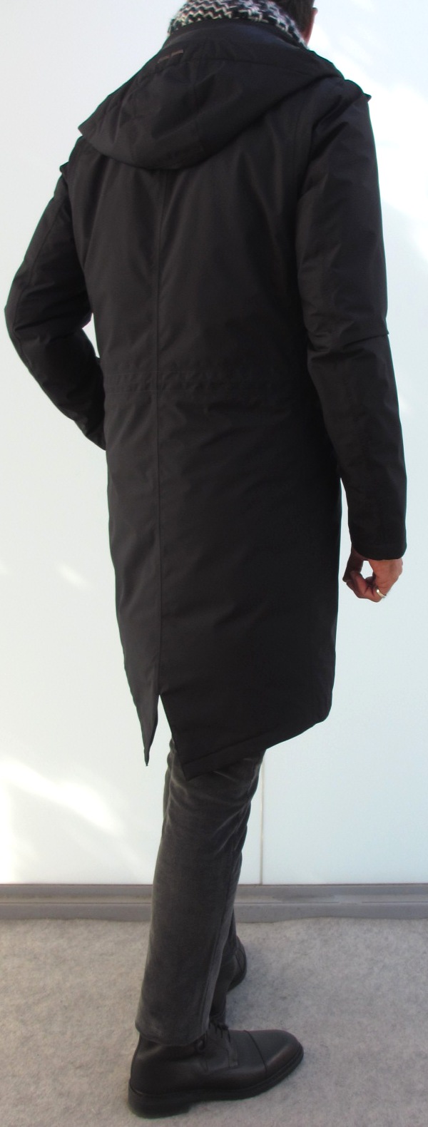 もちろん、軍用「M-51」のようなミリタリー色はありません。フードも取り外し可能で、肩にエポレットのないシンプルなデザイン。ただ特徴であるハンドポケットや裾の後ろが燕尾状に先割れしたフィッシュテールは、正にモッズコート。写真上は、ウエストに付いたドローコードを調整していませんが、ぐっと絞り込めばセクシーなクロスラインが出てきます。