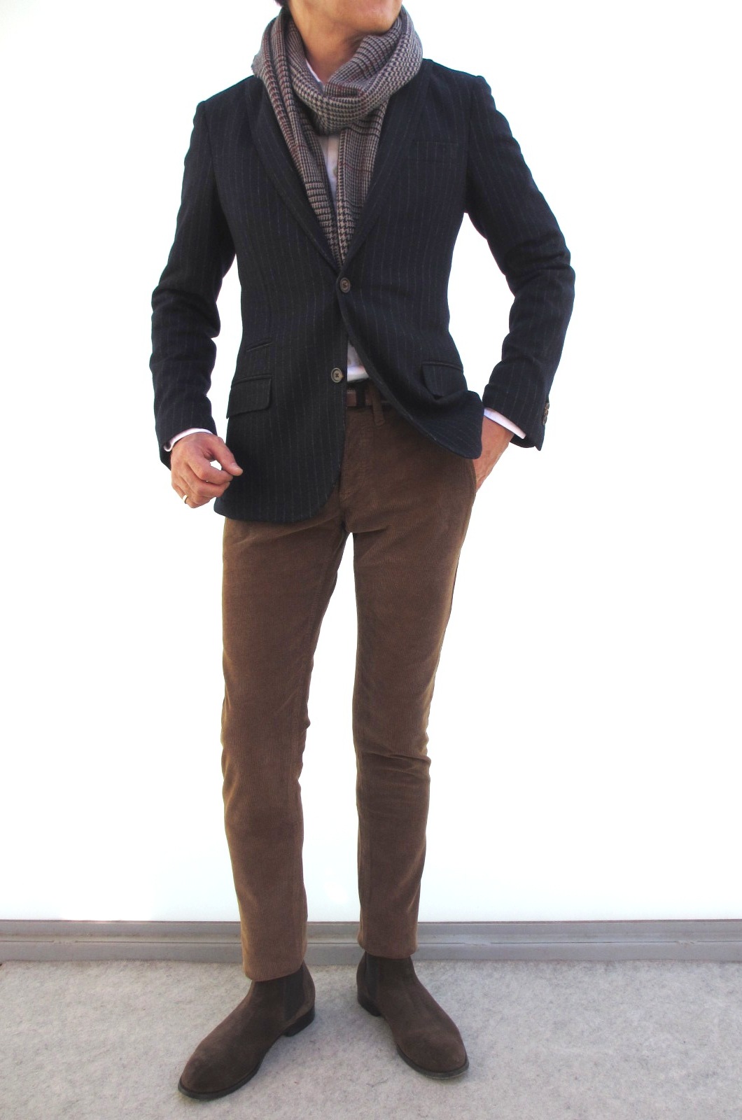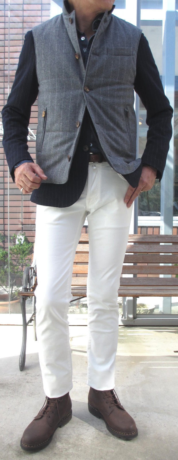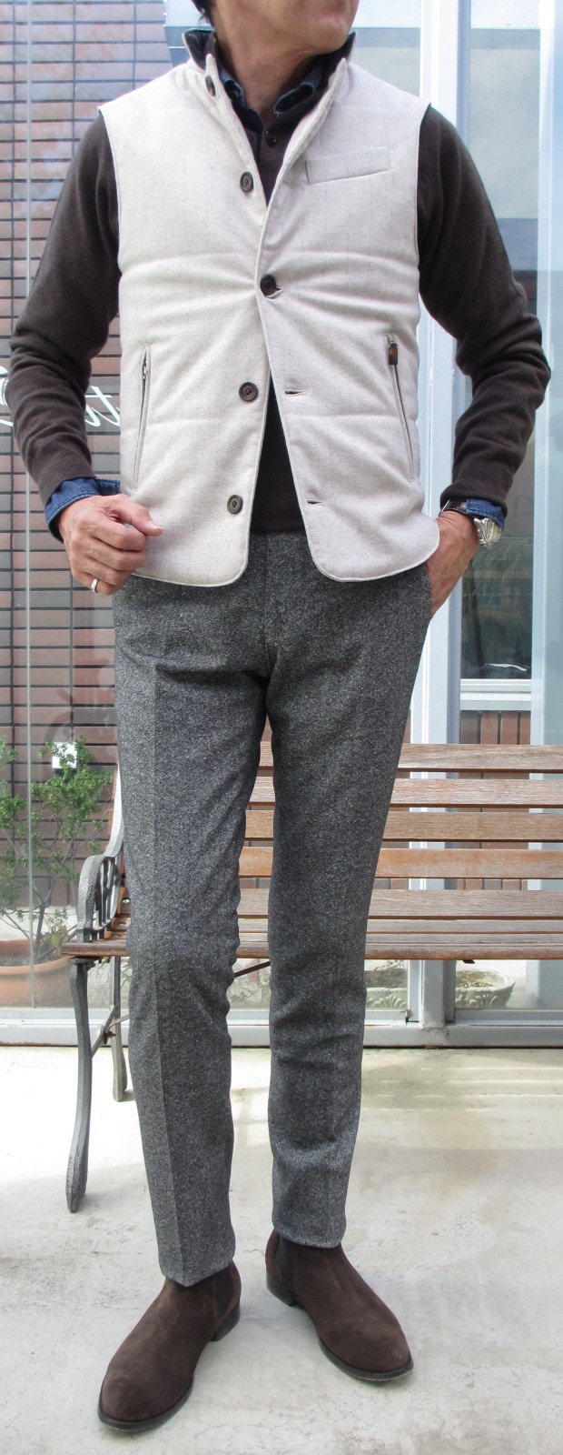 敢えてジレを合わせ、タイをしてみましたが、ジャケットの色を拾ったニットを合わせ、柔らかなグラデーションで組み合わせても素敵でしょうね。様々なコーディネートでオンオフと使いこなせそうです。