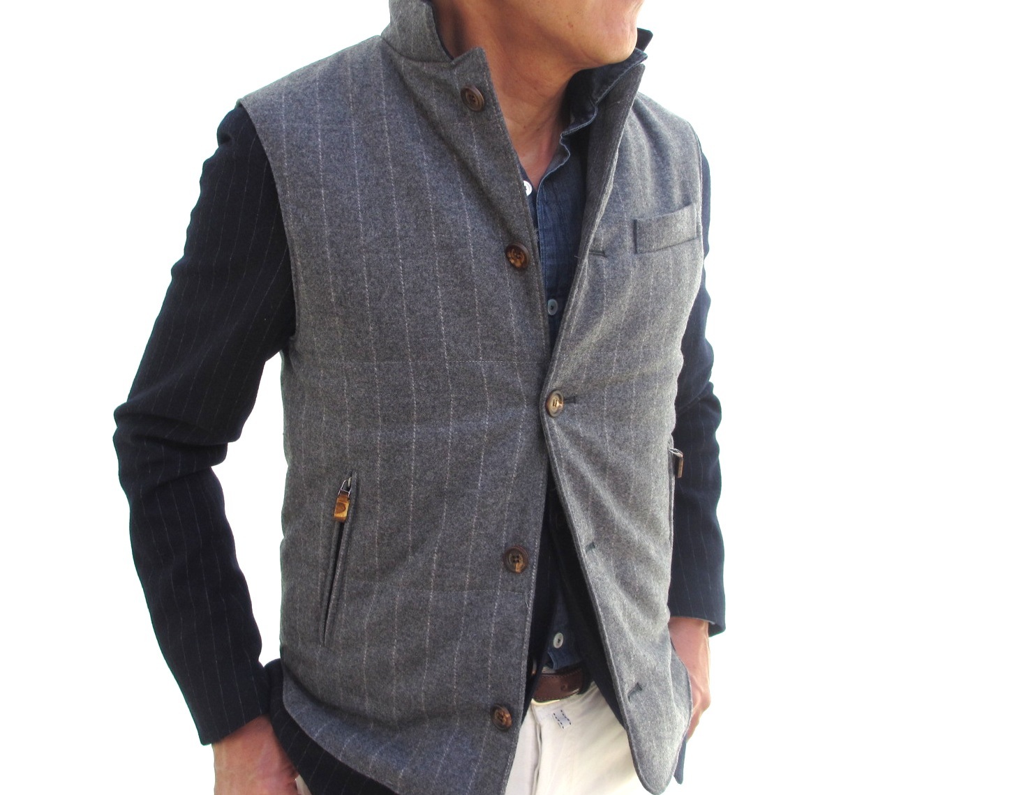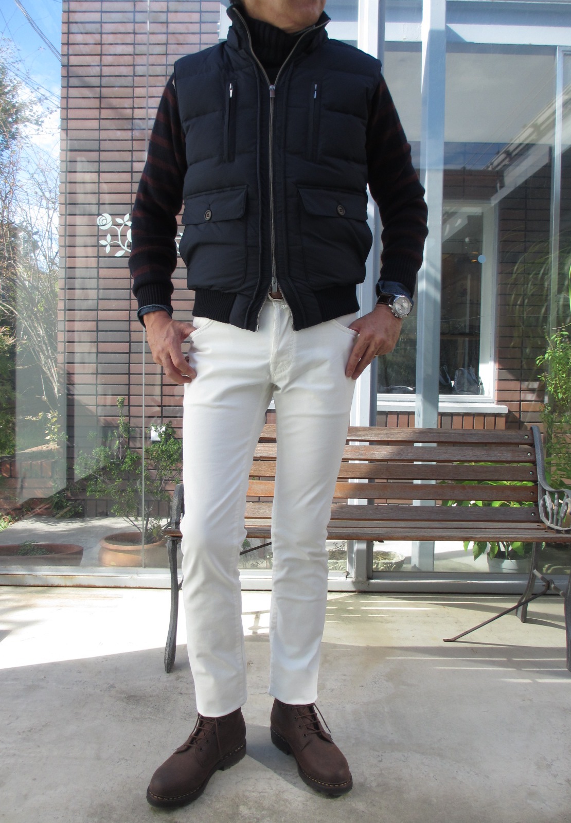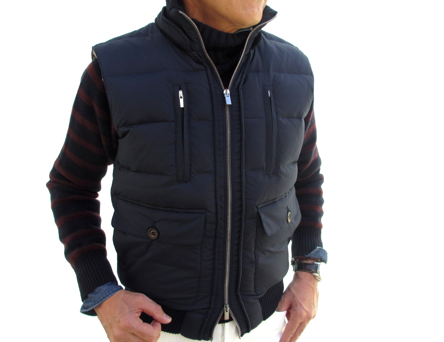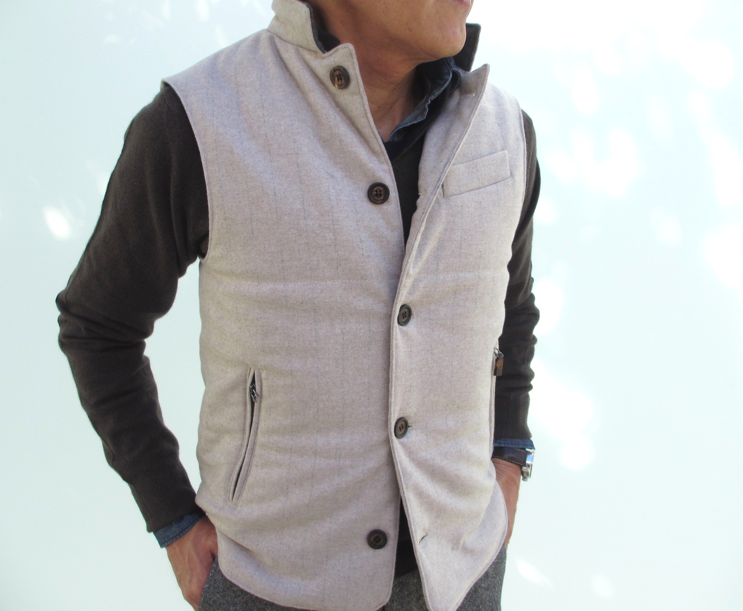 ミリタリー色の強いダウンベストも、どこかエレガントです。そこには、ラグジュアリーカジュアルブランドと呼ぶ【eleventy/イレブンティ】の表現力かもしれません。