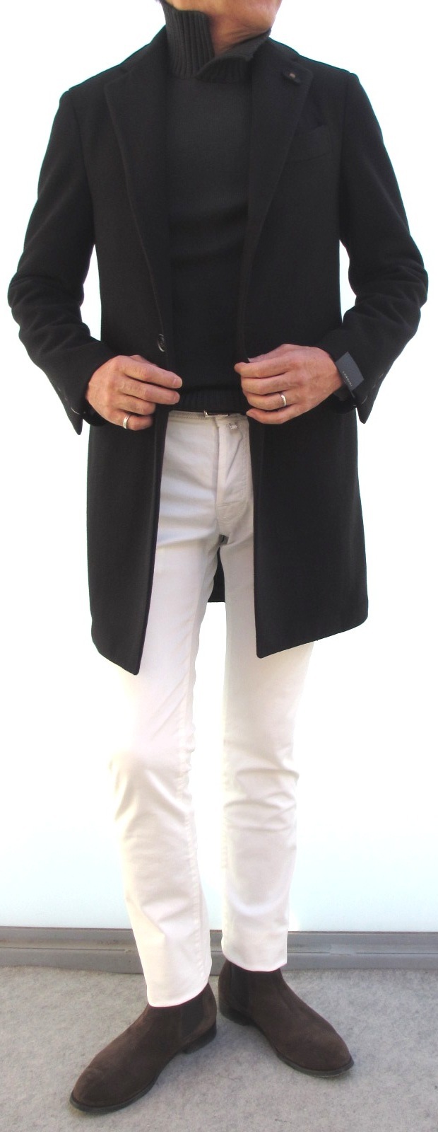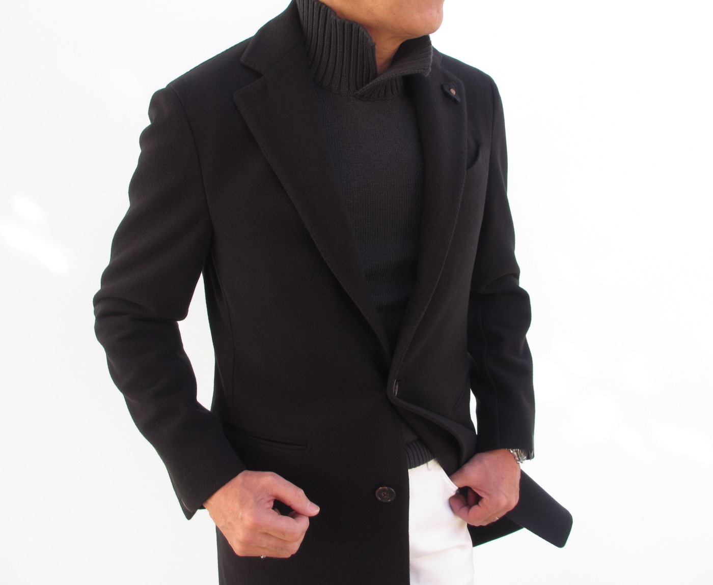 シンプルで美しいフォルムのシングルチェスターコート。高めに設定されたゴージ位置(ラペルの上襟と下襟をつなぐ部分)と絞込みは、重心を上げ、背を高く見せる効果があります。また脚長効果が出る絶妙な着丈の長さ。全て計算された【TAGLIATORE/タリアトーレ】のデザイン。オーナー兼デザイナーのピーノ・レラリオ氏の拘りを改めて感じます。