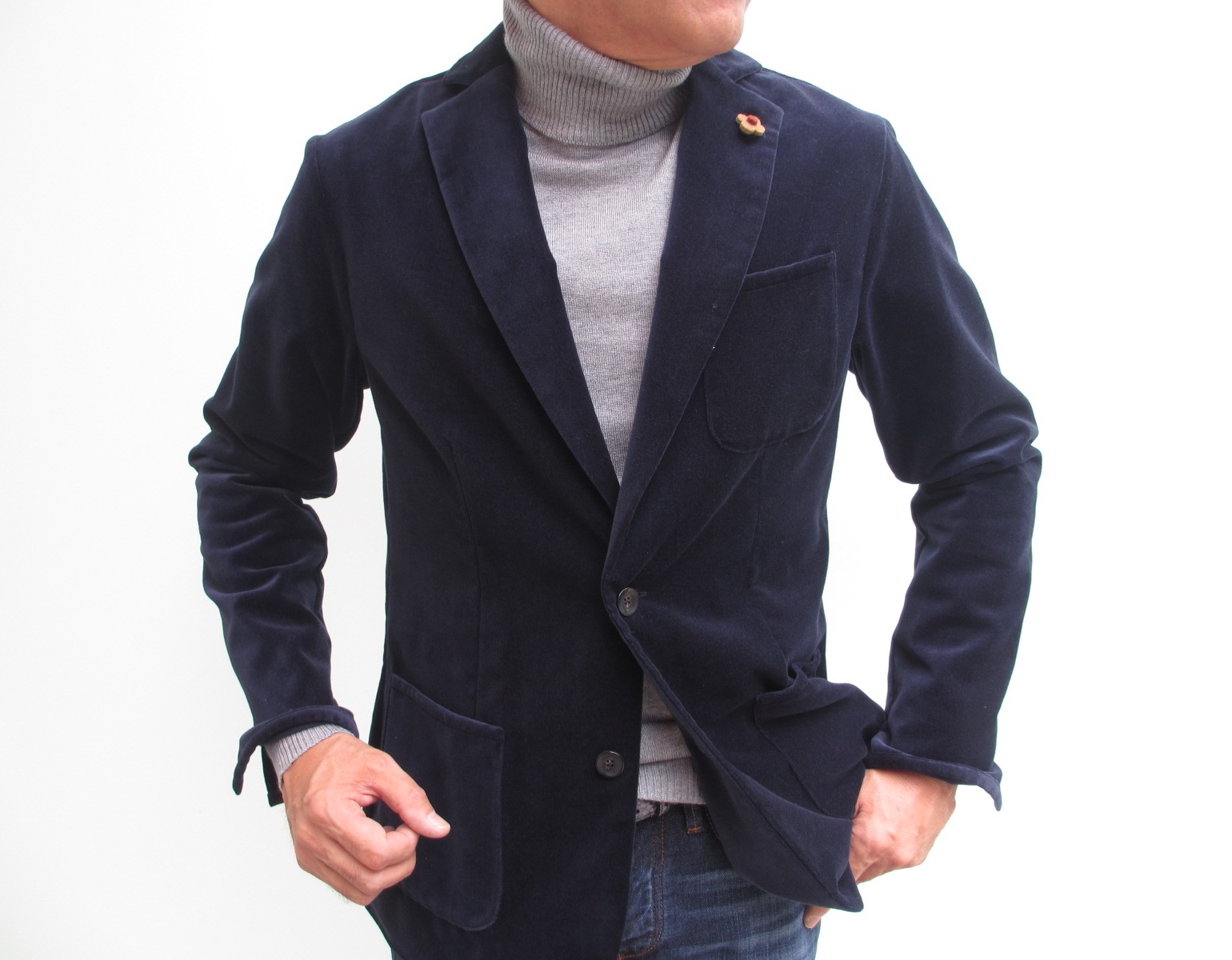 ジャケット同様、ネイビーの胡桃釦をセレクトです。ブラックやブラウンの胡桃釦が多い中、【TAGLIATORE/タリアトーレ】の釦コレクションには、様々な色が。全体のバランスを整える為に、釦の拘りは欠かせません。