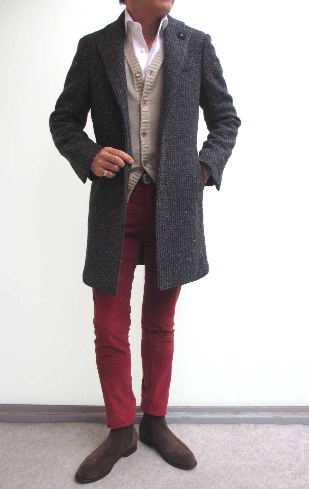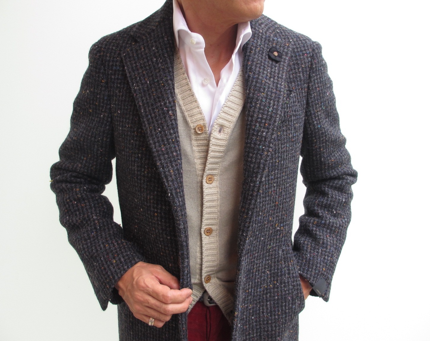 グレイベースにモノクロのネップ入りは、ドニガルツィード。様々な着こなしが頭に浮かぶ万能コートです。まずは、オトコの哀愁を引き出すコーディネートで攻めてみてください。女性を引き立たせながら、自己主張できるコートになるはずです。