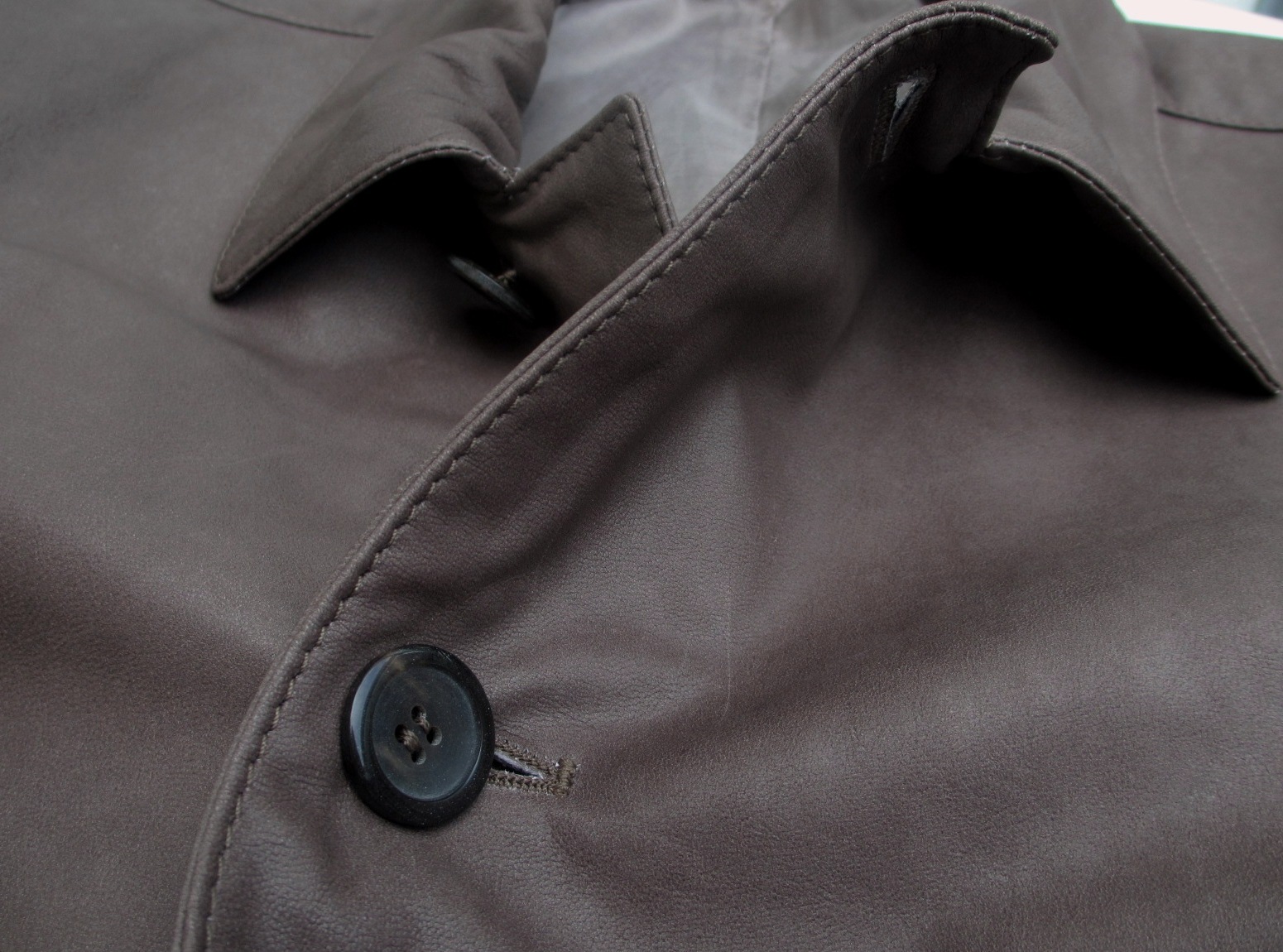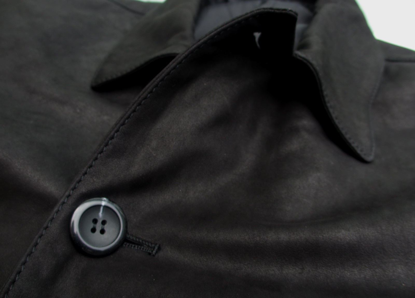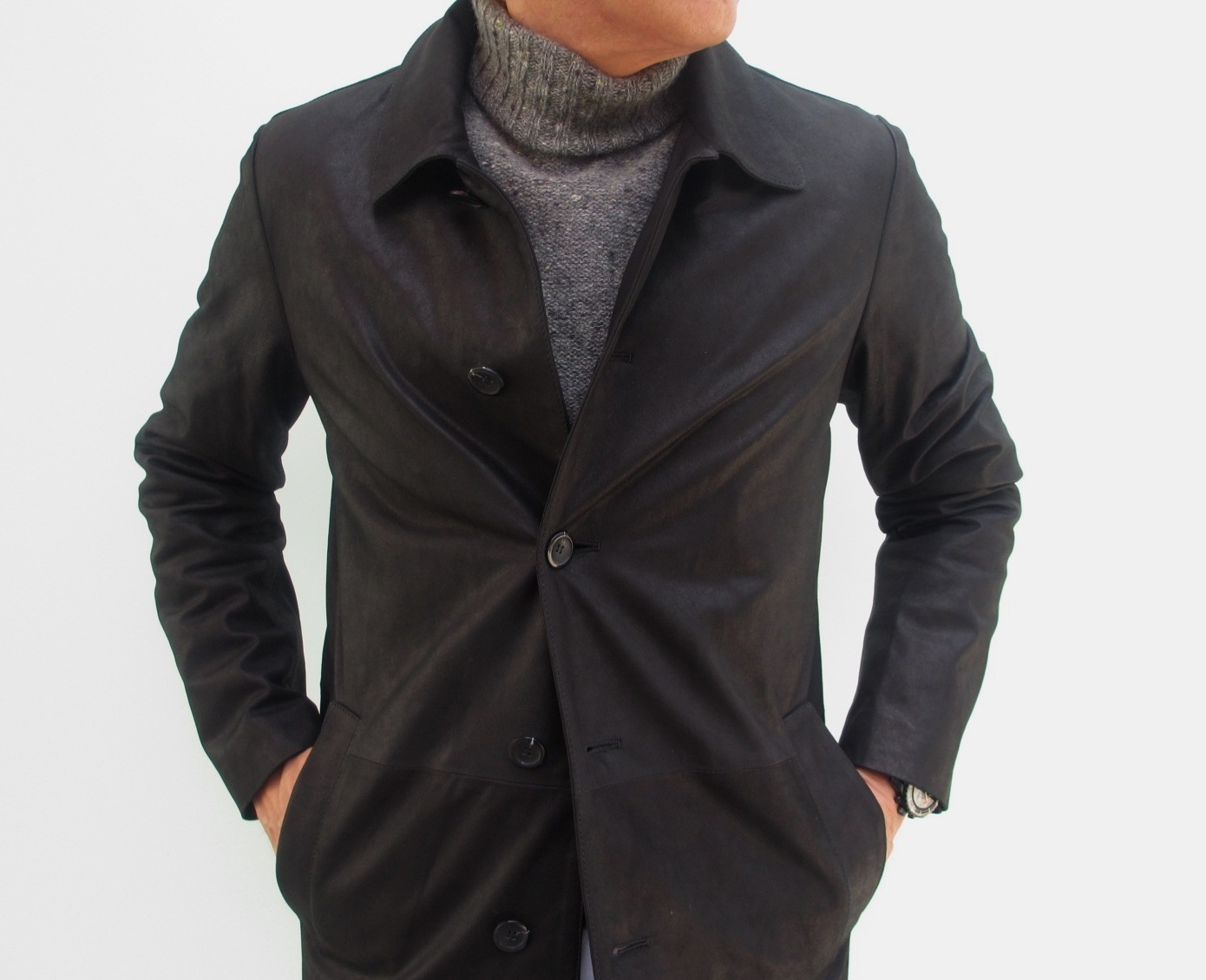 シープスキン(羊革)の銀面部分を加工することで、豊かな表情に。シワによる枯れ木のごとき渋さを出すシュリンク加工とは違います。部分的にペーパーをかけたようなスレーキーな光沢としなやかな革の贅沢な抜け感が見事にマッチしたシングルコートに仕上がっています。