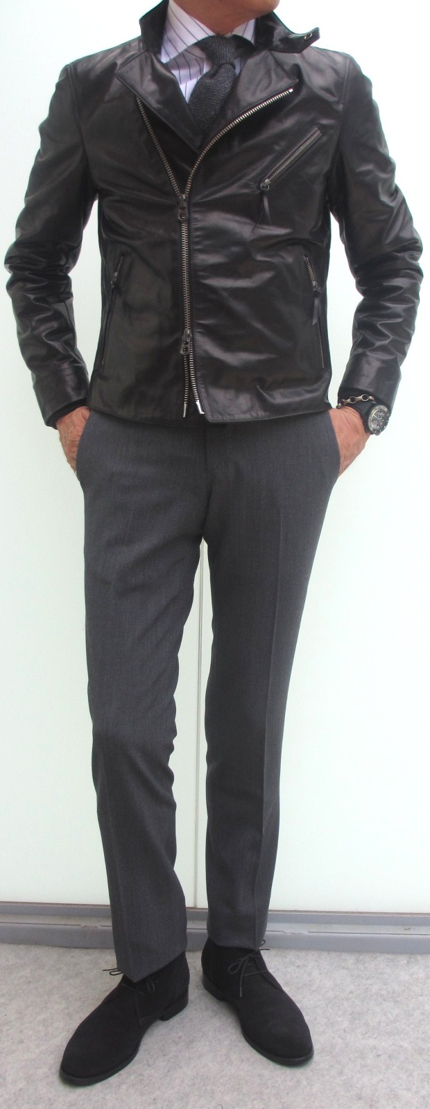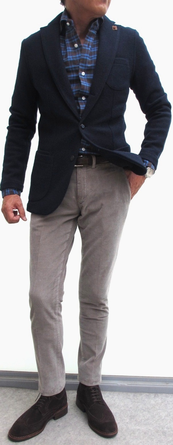 モデルは身長175㎝、体重63㎏、胸囲91㎝で、グレイはXSでジャスト、ネイビーはXSをややタイトに着用しております。グレイで合わせたシャツはFinamore(未公開)、パンツはPT01(未公開)、靴はParaboot、ネイビーで合わせたシャツはBARBA(未公開)、パンツはSIVIGLIA、ベルトはWilliam、靴はParabootです。