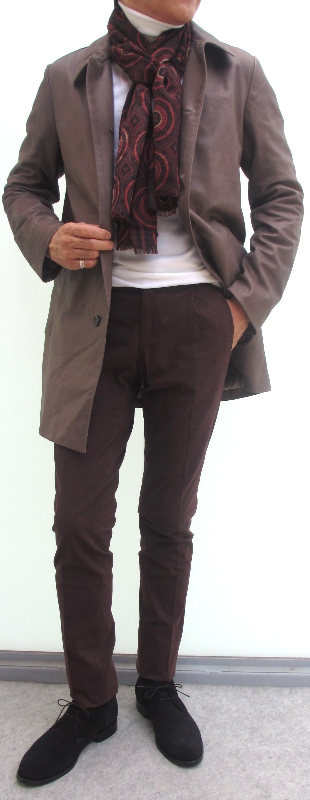 モデルは身長175㎝、体重63㎏、胸囲91㎝でサイズ46を着ております。ブラウンで合わせたシャツはVanacole(未公開)、ストールはFRANCO BASSI(未公開)、パンツはPT01(未公開)、靴はDOUCAL'S。ブラックで合わせたシャツはBARBA、ネクタイはFRANCO BASSI(未公開)パンツはPT01の「TRAVELLER」、靴はDOUCAL'Sです。