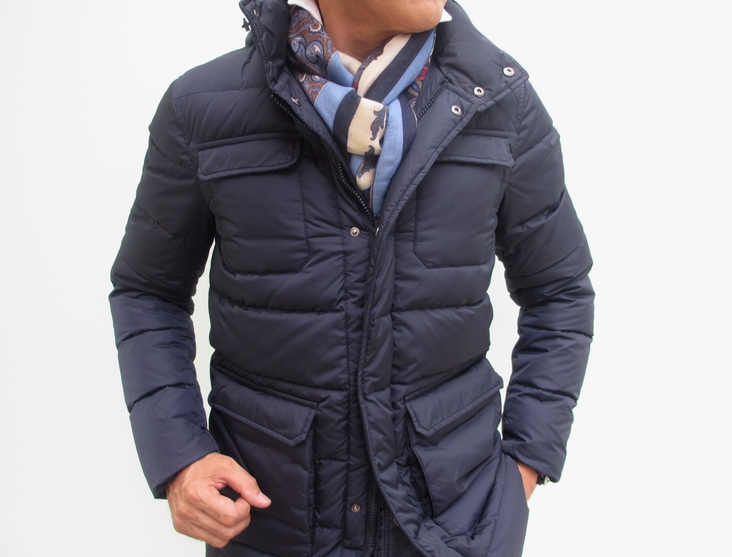 グレイッシュなオリーブ、ネイビー共に、柔らかな印象。ミリタリーテイストを残しながらも【HERNO/ヘルノ】らしい上品な仕上がりです。