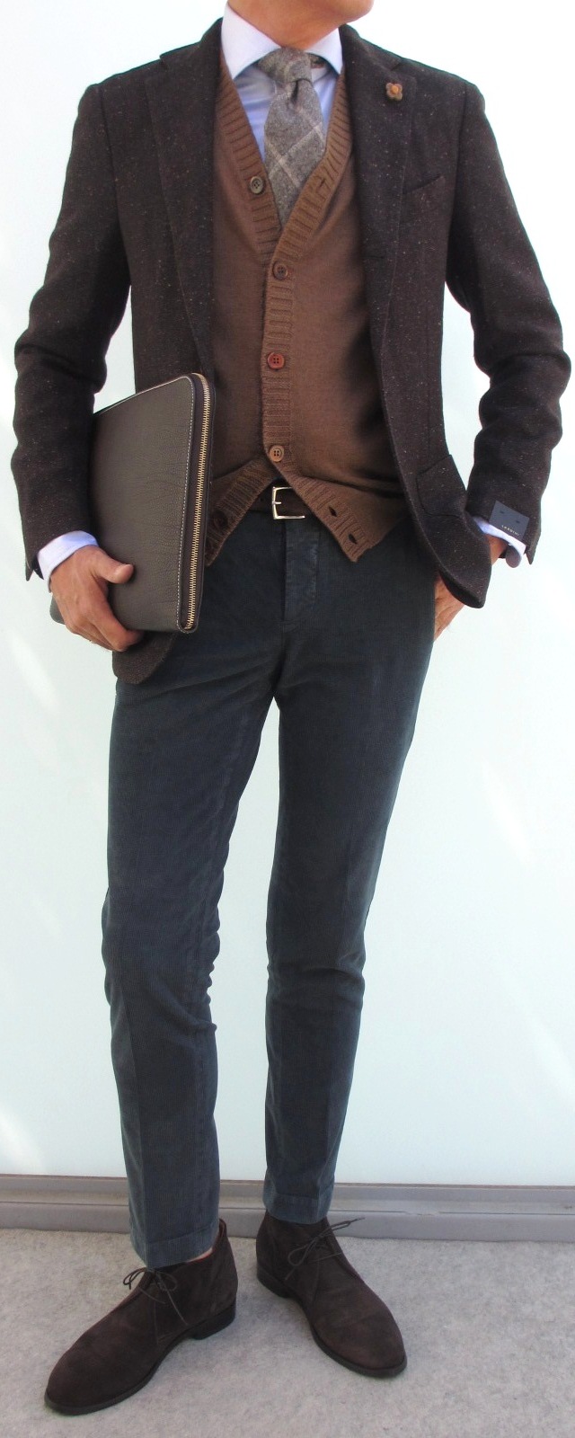 モデルは身長175㎝、体重63㎏、胸囲91㎝で、サイズ44を着用しております。合わせたシャツはBARBAの「CULTO」、ネクタイはブラウンがFRANCO BASSI、ブルーがLuigi Borrelli、ニットはCruciani(未公開)、ベルトはWilliam、パンツはブラウンがPT01(未公開)、ブルーがBERWICH、靴は DOUCAL'Sです。