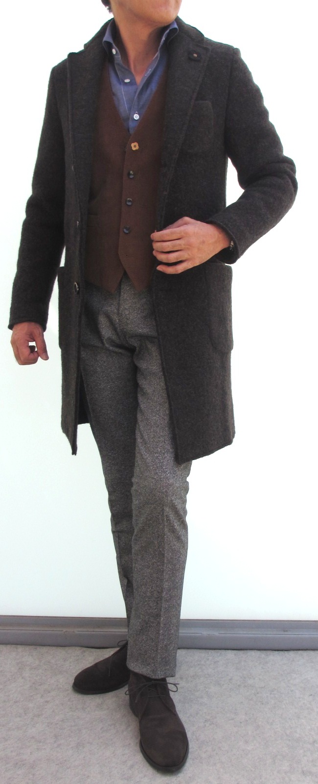 前回ご紹介させていただいた「ベルト付きミックス調ダブルチェスターコート」より、3,4cmほど着丈の短いモデル「CFBCMOB」。ウエストのポケットもフラップのみ。大き目のラペル、ダブルの6釦は同じデザインです。よりジャケットに近いスポーティーさを楽しむなら、お勧めのコートです。