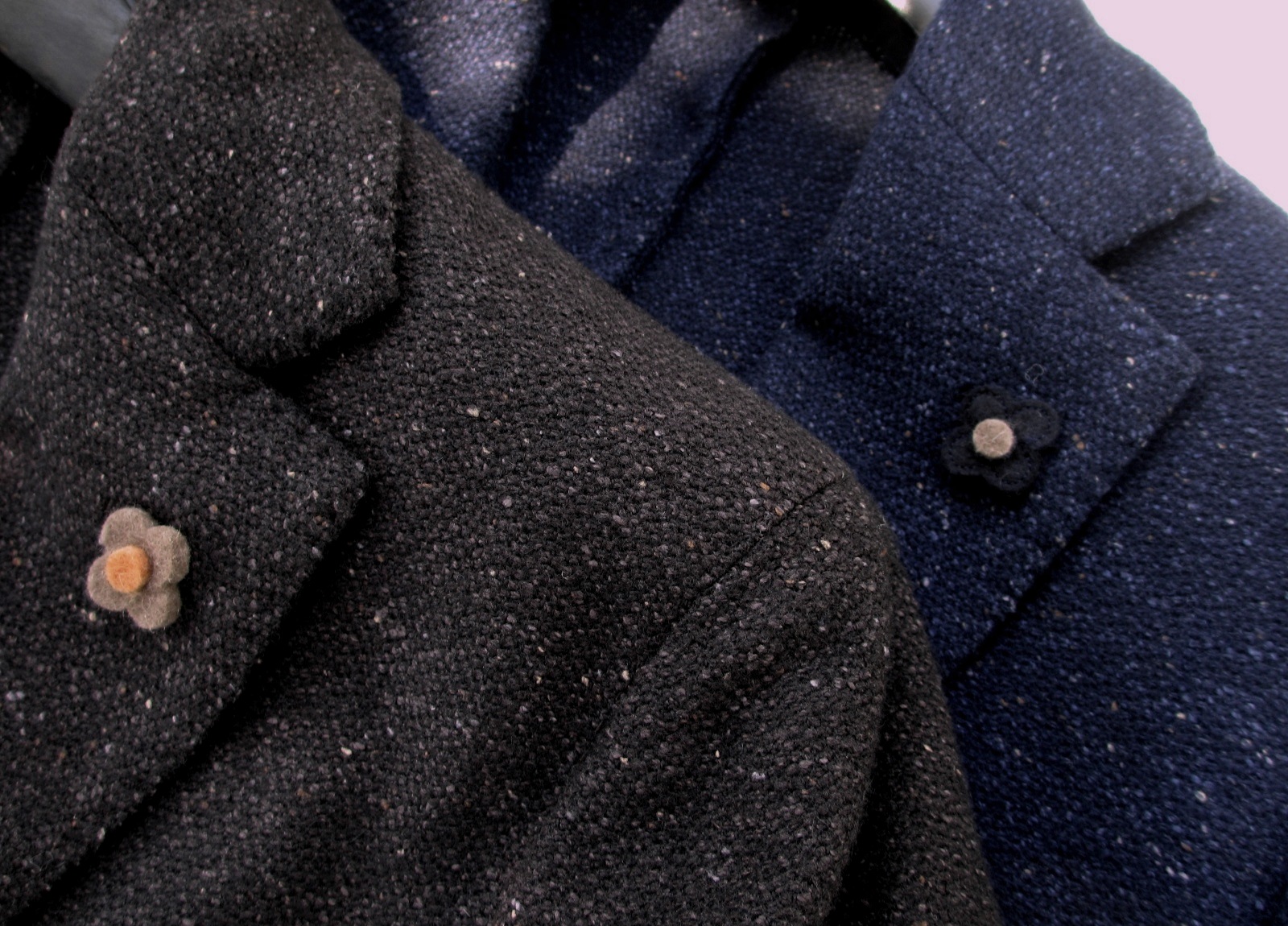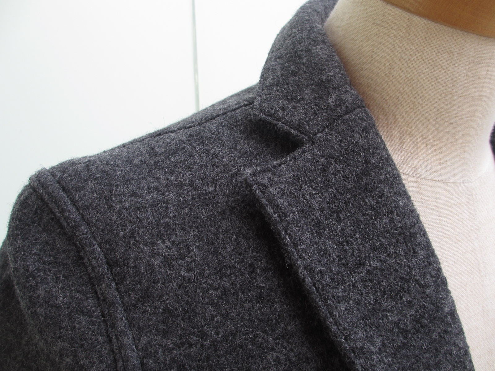 モデルは同じでも、素材は異なります。グレイは、ツィーディなウール100%。ネイビーは、ウールとナイロンの混紡で、グレイに比べるとしなやかです。サイズ感も異なり、ネイビーのほうがグレイよりタイトになります。なぜか、グレイにはプートニエールが付きません。