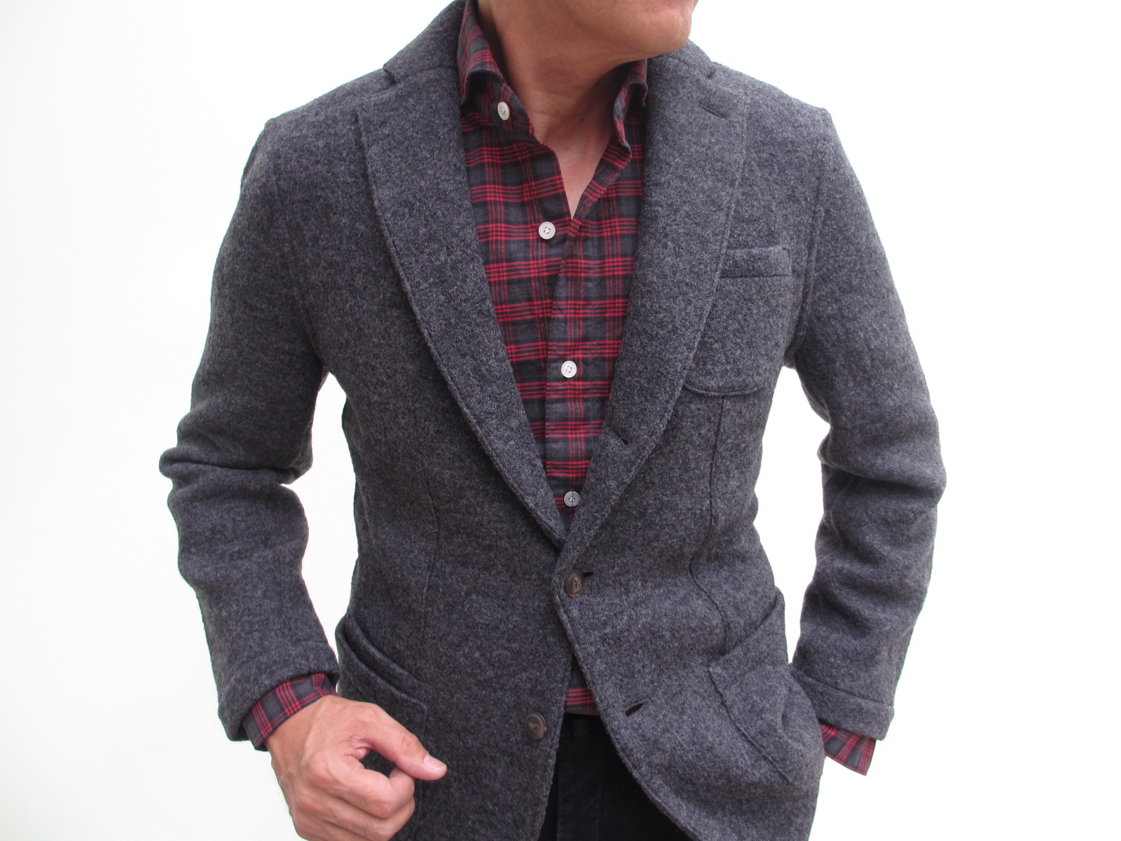 英国回帰の中、伝統柄ハウンドトゥースは外せません。ただ従来の白黒だけでは、コーディネートにきつさが出てしまいます。そこでセレクトしたのは、カラーネップ入りの生地。よく見ると、朱赤、オレンジ、グリーン、ブルーの糸が入り、更に中茶の胡桃釦を付けることで、全体を柔らかな表情に。色が加わることで、コーディネートの幅も広がります。