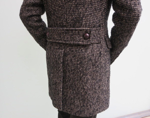 上のチェスターコートより、ややゆとりを持たせたベルト付きダブルチェスターコート。展示会で注目を浴びたコートです。男らしい黄昏コートとして、ミリタリーなコーディネートがお勧めです。