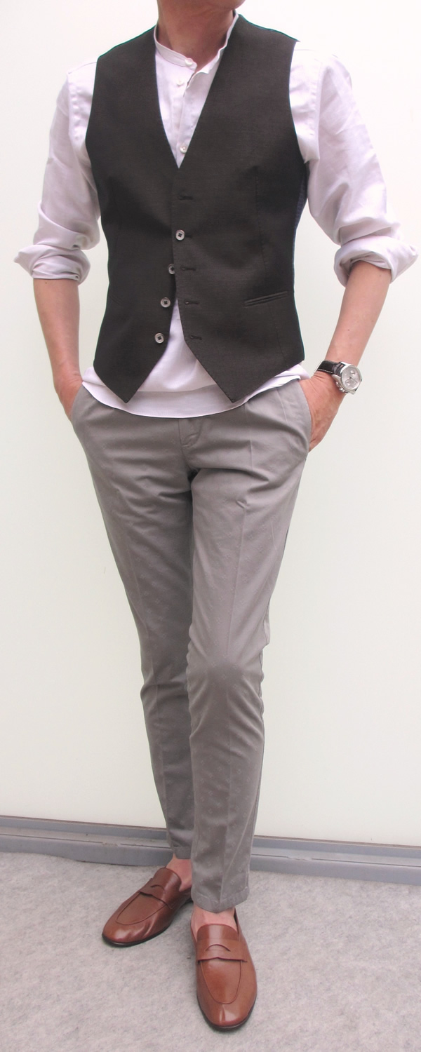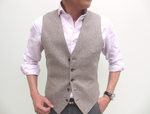まずは、単品のジレ。ジャケットにするには、やや濃いブラウンでしょうか。ジレのみの展開です。