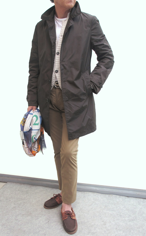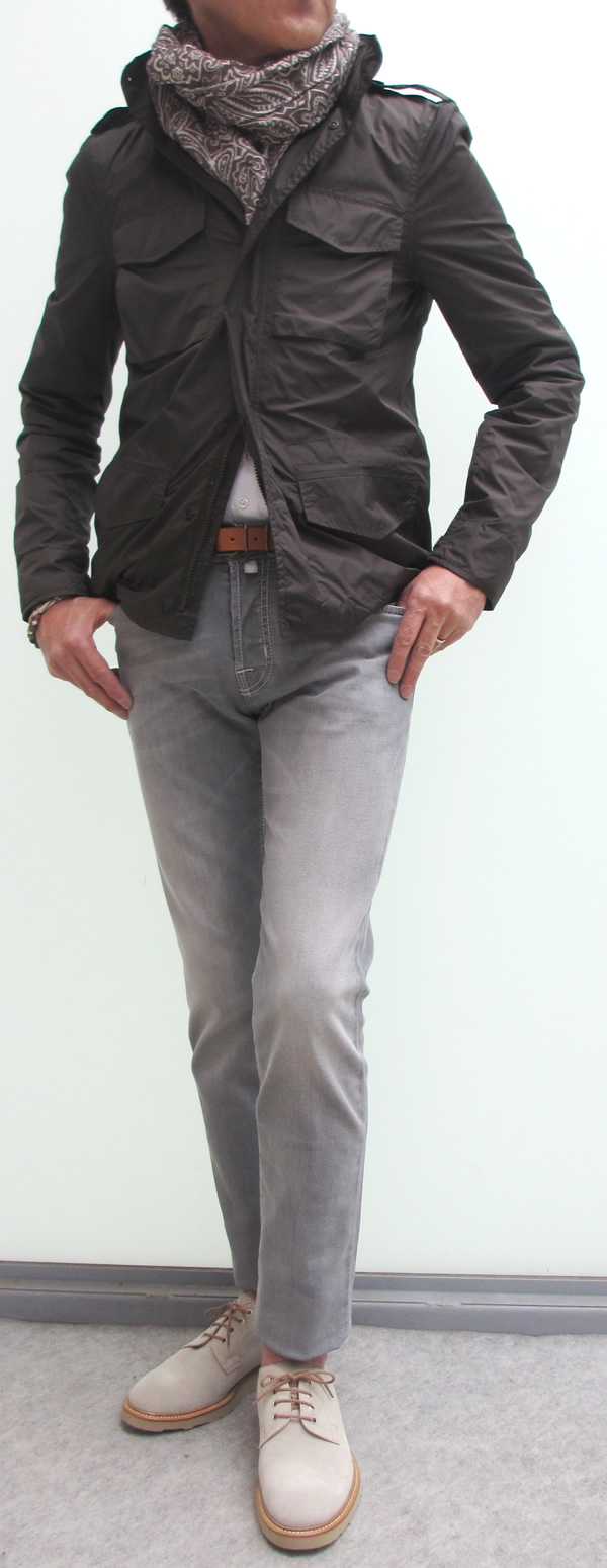 ジャケットやローゲージからミドルゲージのニットを着ることを考慮すれば、サイズSでジャストです。昨夜、突然の雨にタカイが選んだのも、この【ASPESI/アスペジ】の「LIOMONE」。電車と自転車を乗り継いで出勤する彼にとっては、コストパフォーマンスの高い買い物だったはずです。