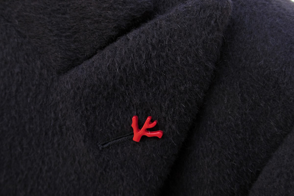 アイコンのRED CORAL(赤珊瑚)は、たぶん外して着ると思います。でも、この裏地の赤のパイピングとブランドタグがあれば十二分に自慢できます。理由は、コートの持ち方にあります。