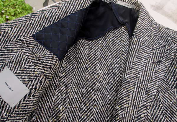 【BOGLIOLI/ボリオリ】のラペル裏、肩から胸にかけてのキルティングも特徴の一つ。補強と防寒の役割として付けられています。肩にバッグを掛ける際にも役立つはずです。