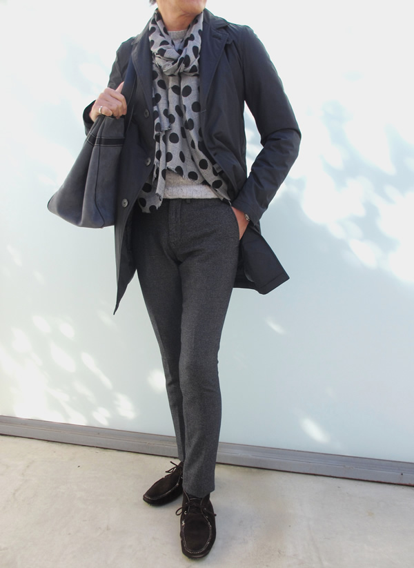 チャコールグレイも素敵です。無彩色のグレイは、殆んどの色と合います。モノトーンでちょいモードな雰囲気に。でも全てをモノトーンにするのではなく、指し色を入れるのが、今の気分でしょうか。