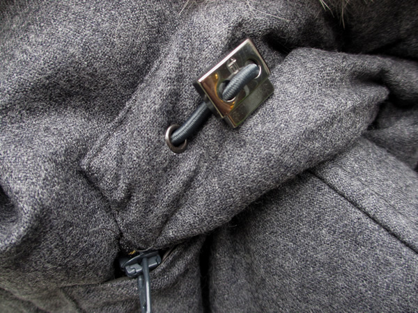 フロントは、ダッフルの特徴であるトグルとジップとの二重留め。冷たい隙間風を防いでくれます。