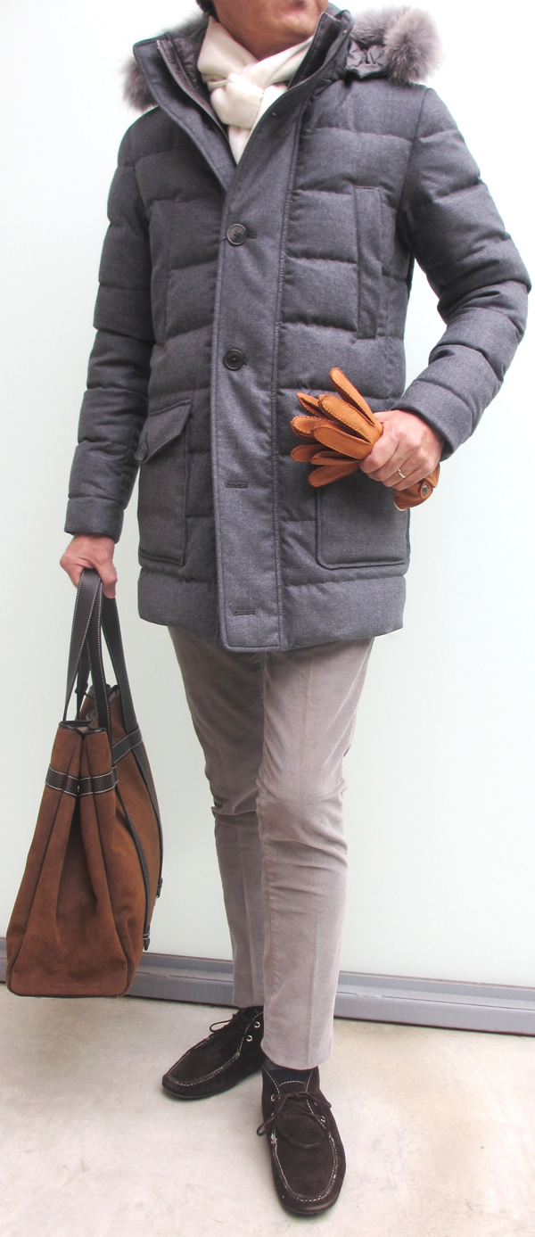 モデルは身長175㎝、体重63㎏、胸囲91㎝でサイズ44をややタイトに着用しております。合わせたストールはALTEA、パンツはJ.W.BRINEのコーデュロイ、靴はDOUCAL'S、バッグはZANELLATO(未公開)です。