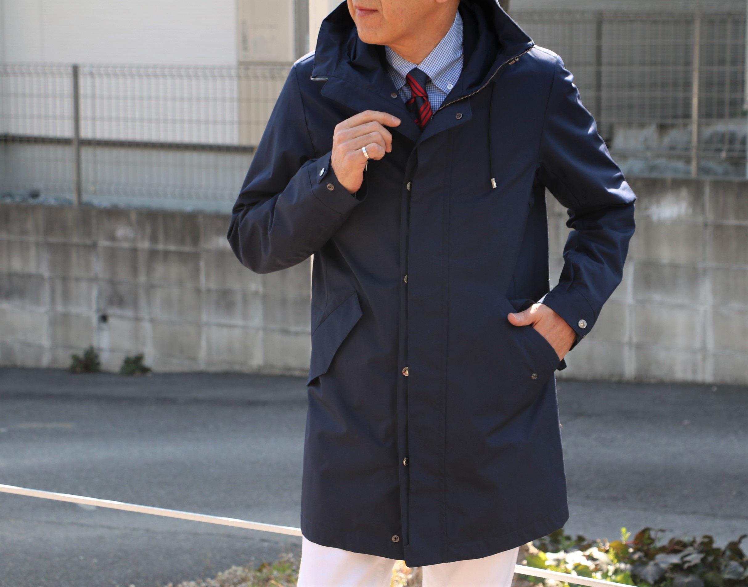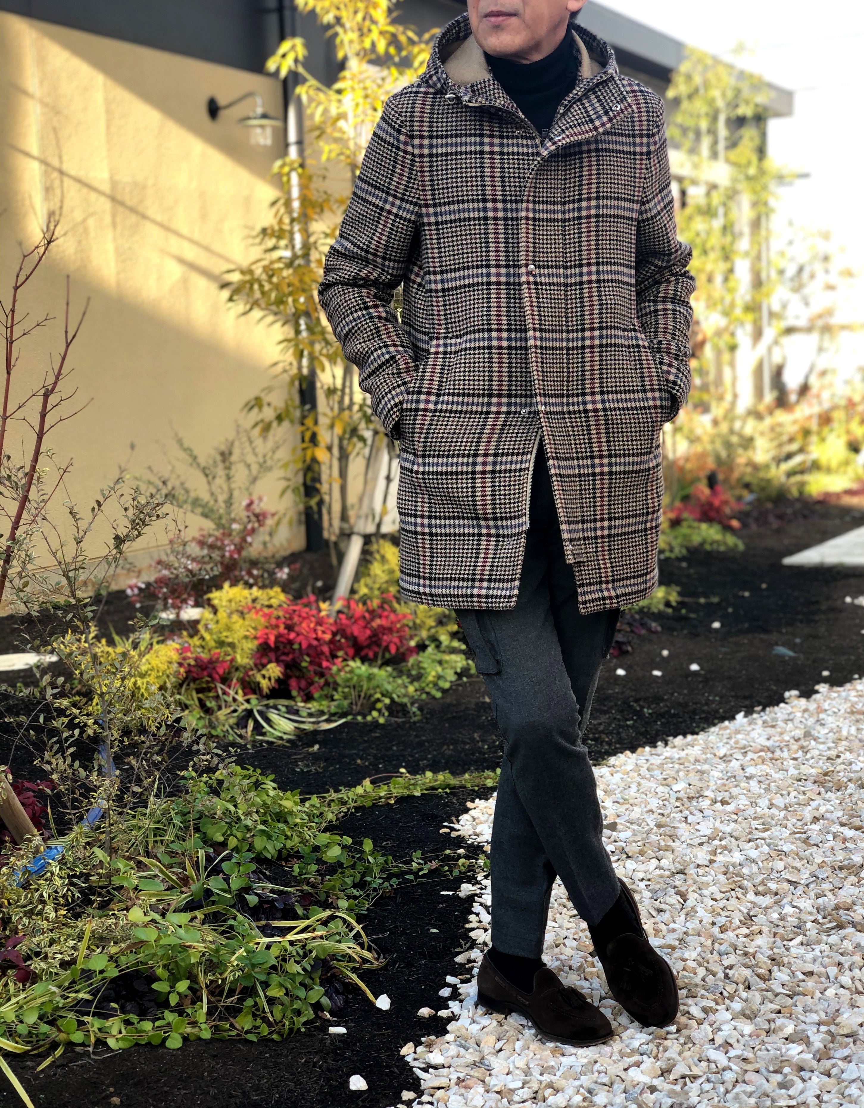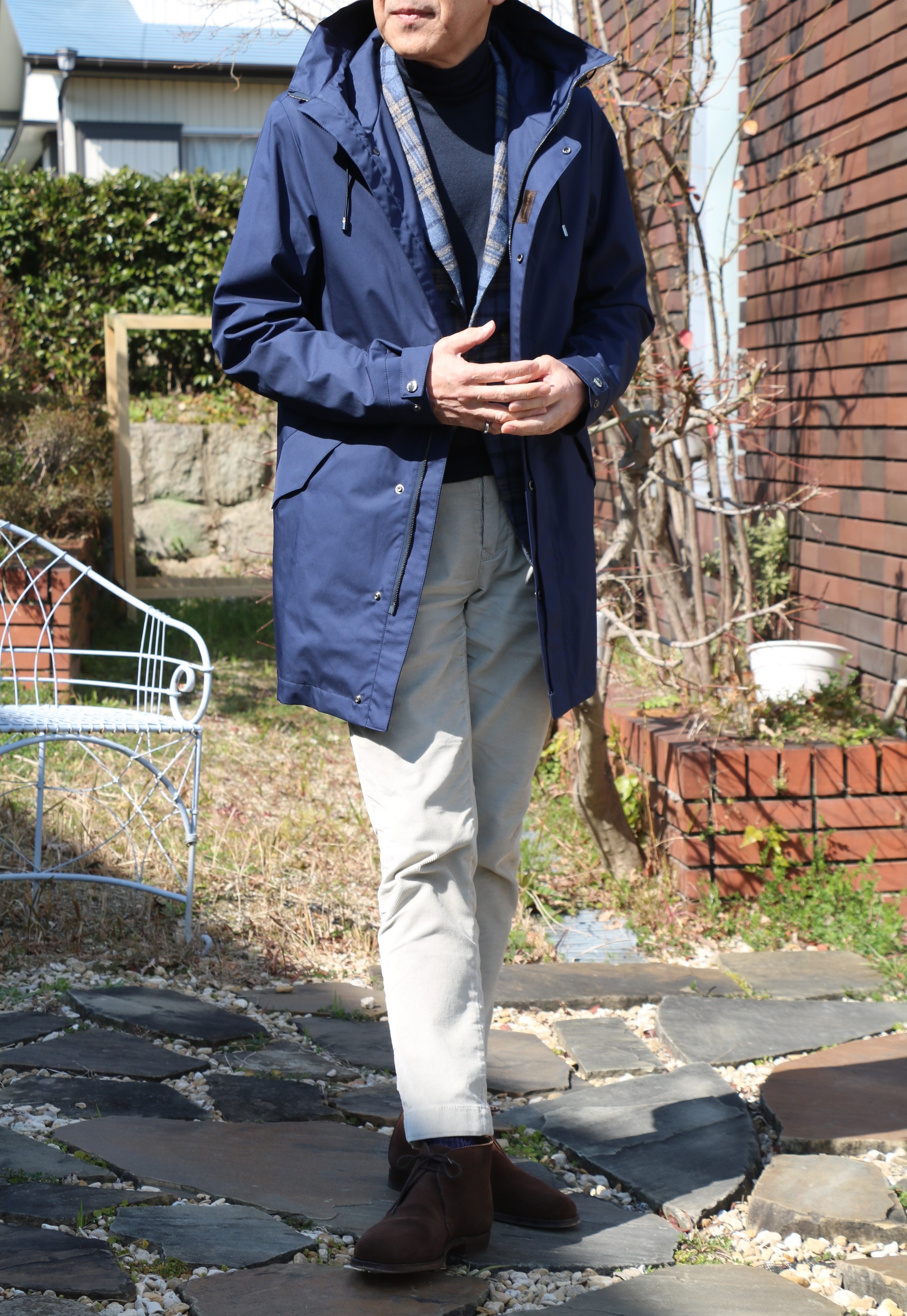 コーデュロイパンツにジャケット、中はハイゲージのタートルネックニットと昨日の出で立ちに羽織ったフーデットのミドル丈コート「WILSON-TES」。寒さの緩む穏やかな日であれば、冬物に合わせて着ることができるのが、このコートの魅力。今シーズンのように暖冬であれば、尚更でしょう。春物と位置付けてはいますが、ハリコシのあるしっかりとした生地は、秋から初冬、最近では真冬でも気温に合わせれば着ることのできる頼りがいのあるコートと言えます。