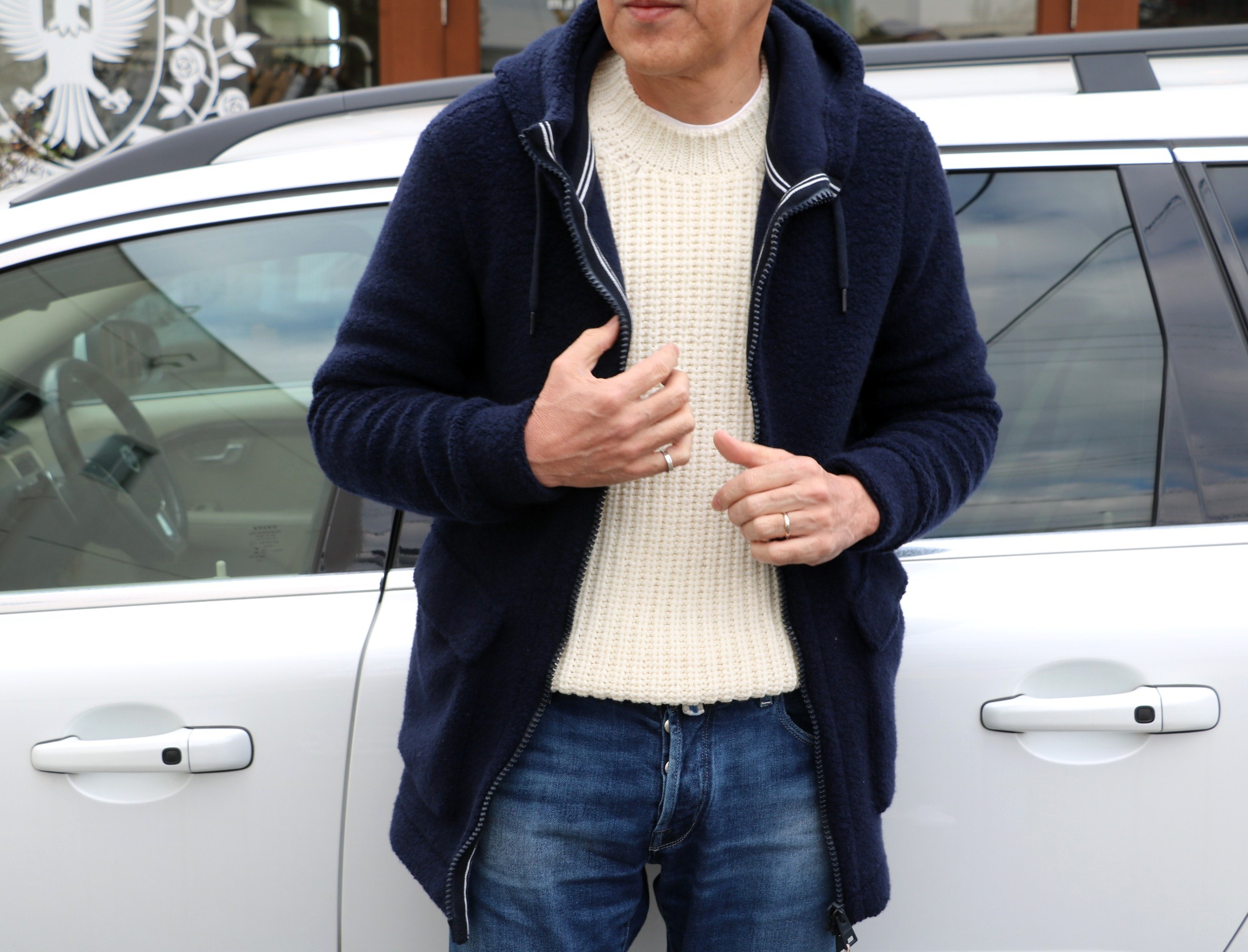 ここ最近、店頭で注目されているのが、こちらのモデル。アルパカ混ウールのフーデットミドル丈コート。ライトブルーとネイビーの配色が雪の結晶を連想させる、シンプルだけど存在感のあるコート。羽織った時の軽さにも驚かれるでしょうが、「それ、どこの?」と訊かれ、「ヘルノだよ」と答えた時の相手の驚きにも注目したいものです。