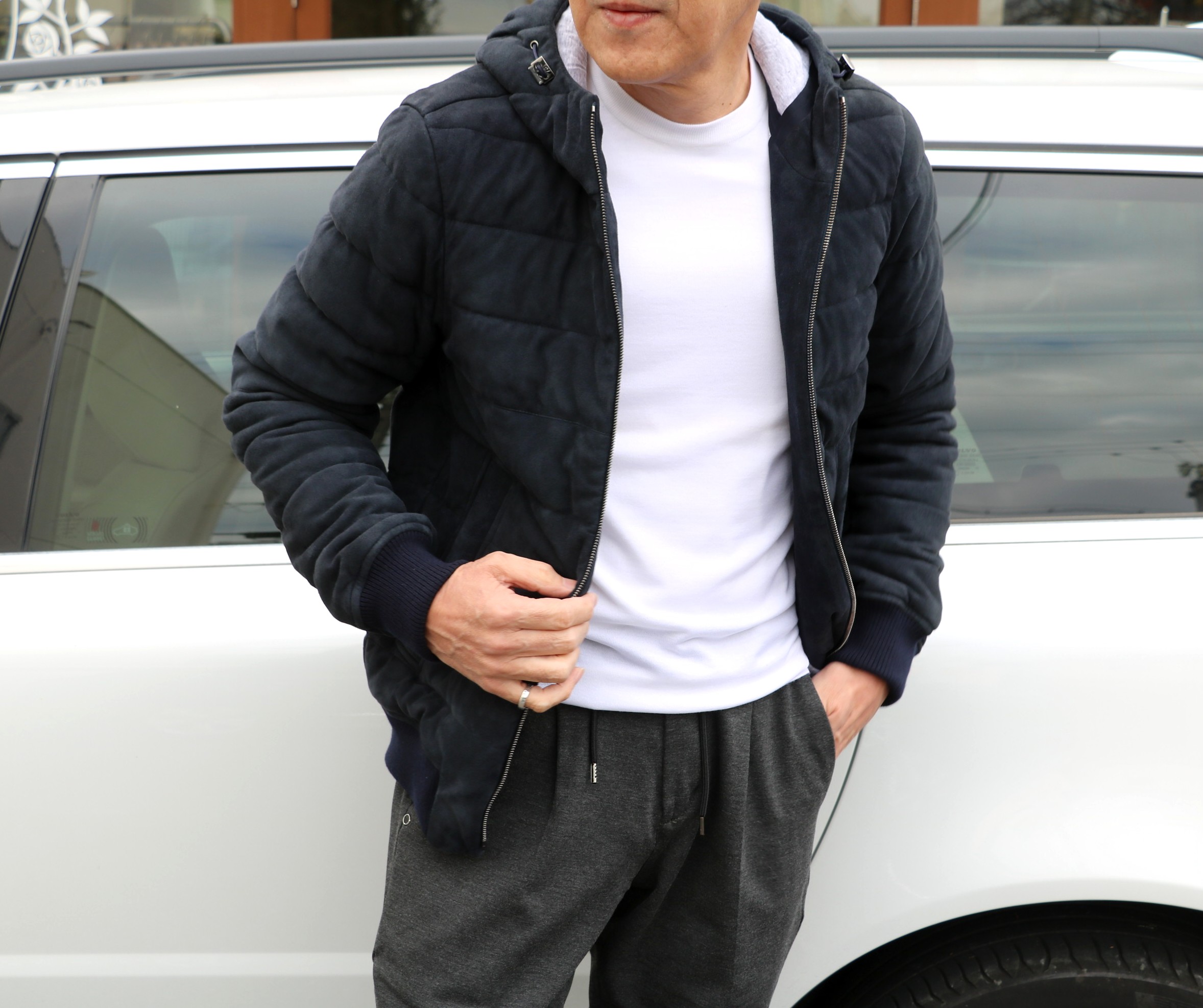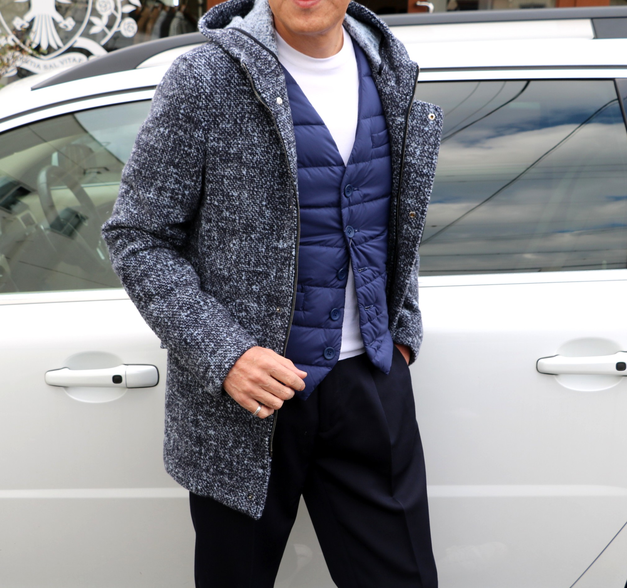 ホワイトとブルーの色を使わないコーディネートです。ニットはFEDELI(フェデーリ)、ダウンジレはHERNO(ヘルノ)、パンツはBorelio(ボレリオ)、足元は見えませんが、Spring court(スプリングコート)を履いています。サイズ46を着用です。