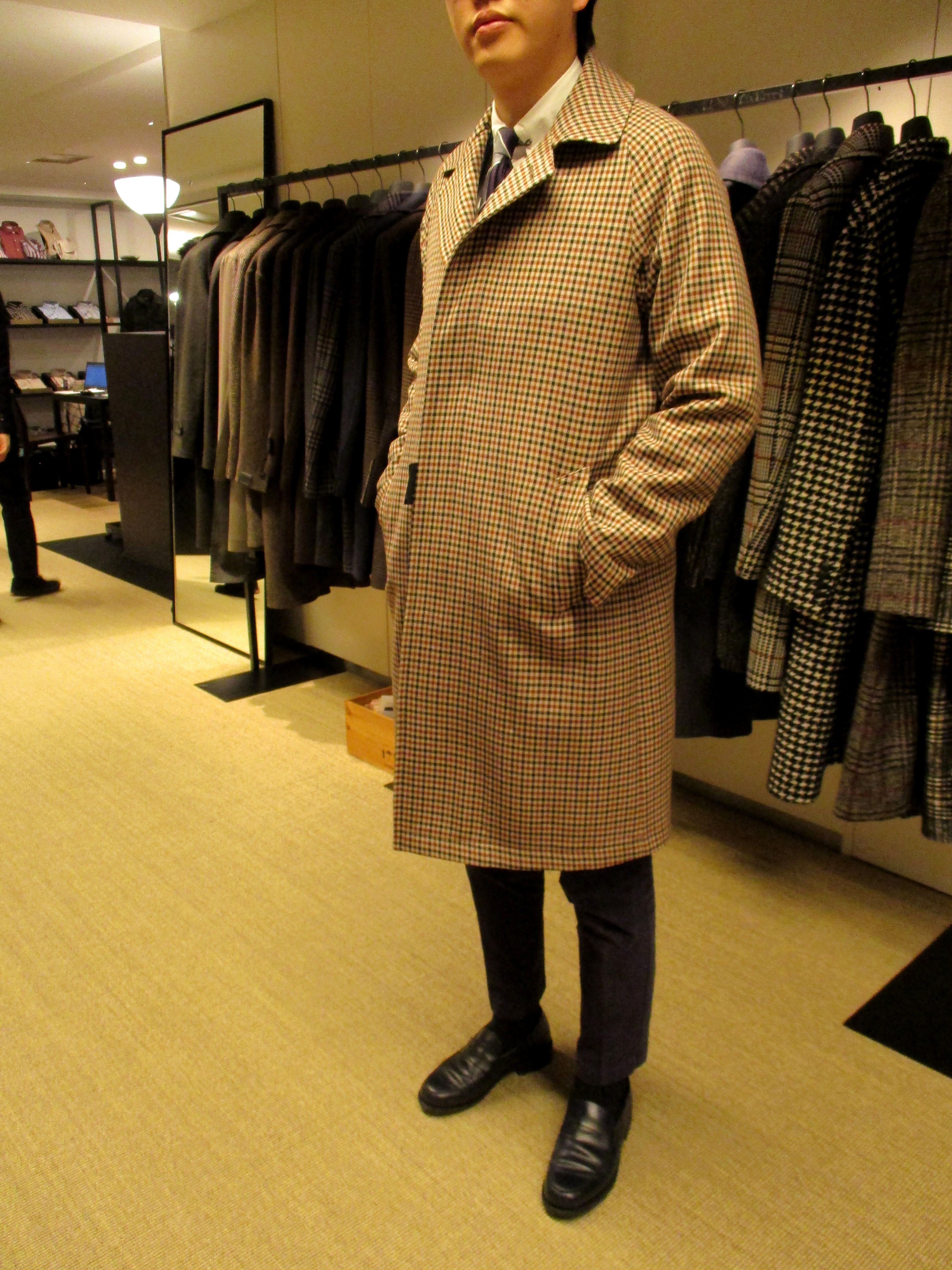 展示会でのサンプルサイズは48が多い為、彼をモデルにして写真を撮ります。この「チェック柄シングルベルテッドコート」は、羽織った瞬間、個人オーダーを決めていたそうです。