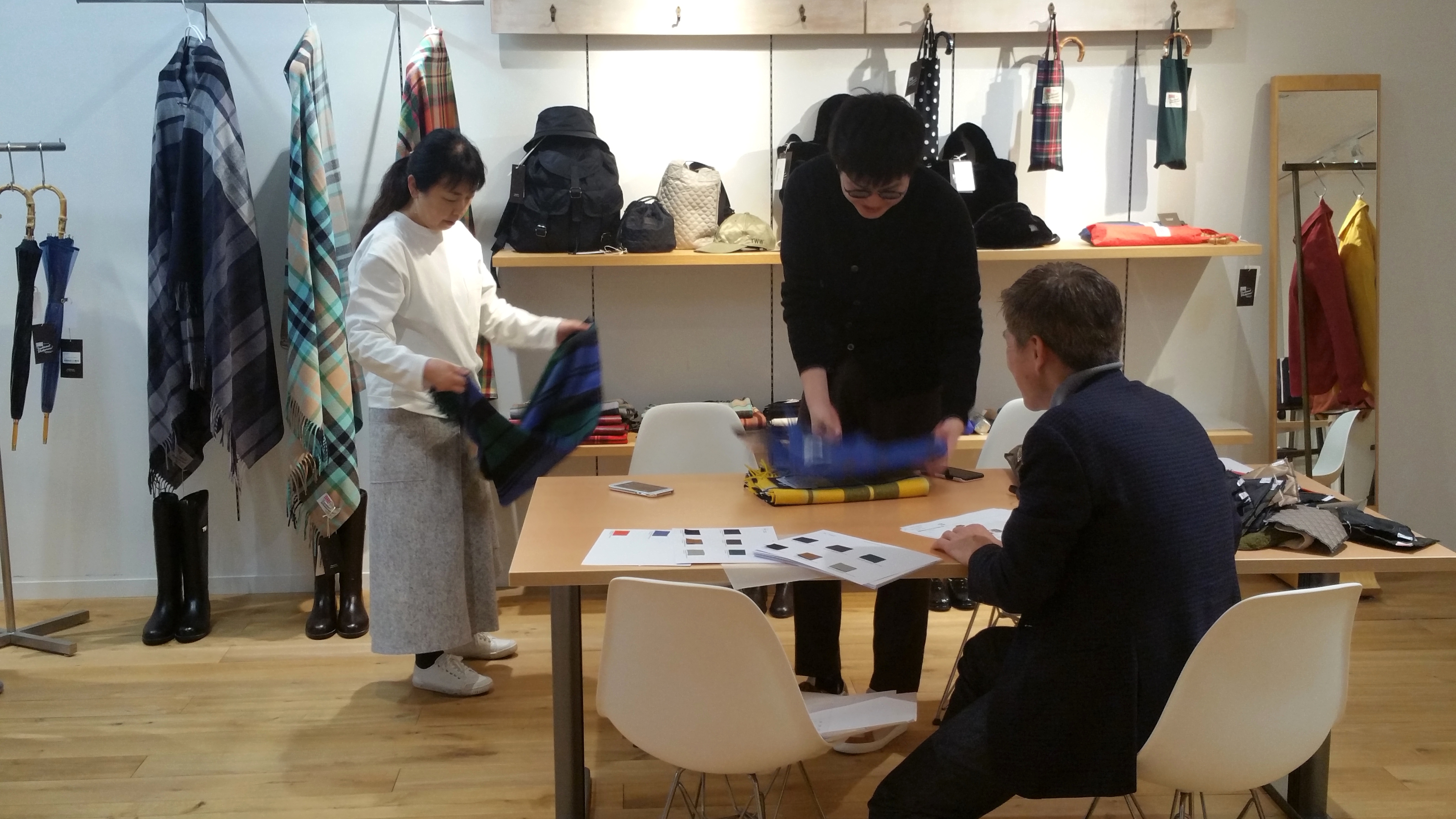 迷ったのは、たぶん、こちらの「チェック柄ラグランバルカラーコート」と「ヘリンボーン柄バルカラーコート」だったはず。初めて展示会で見るコート。実際の生活の中で身に纏い、風景の中に溶け込んだ動きのある姿は、さらに美しく輝きます。店頭で並べられているものは、未完成品。着込む事で少しずつ味わいのある表情を見せる洋服達。購入された後、その服が道具としてきちんと機能しているのか、自分だけではなく周りの人も楽しませてくれているのか、バイイングする私としては大いに気になるところです。