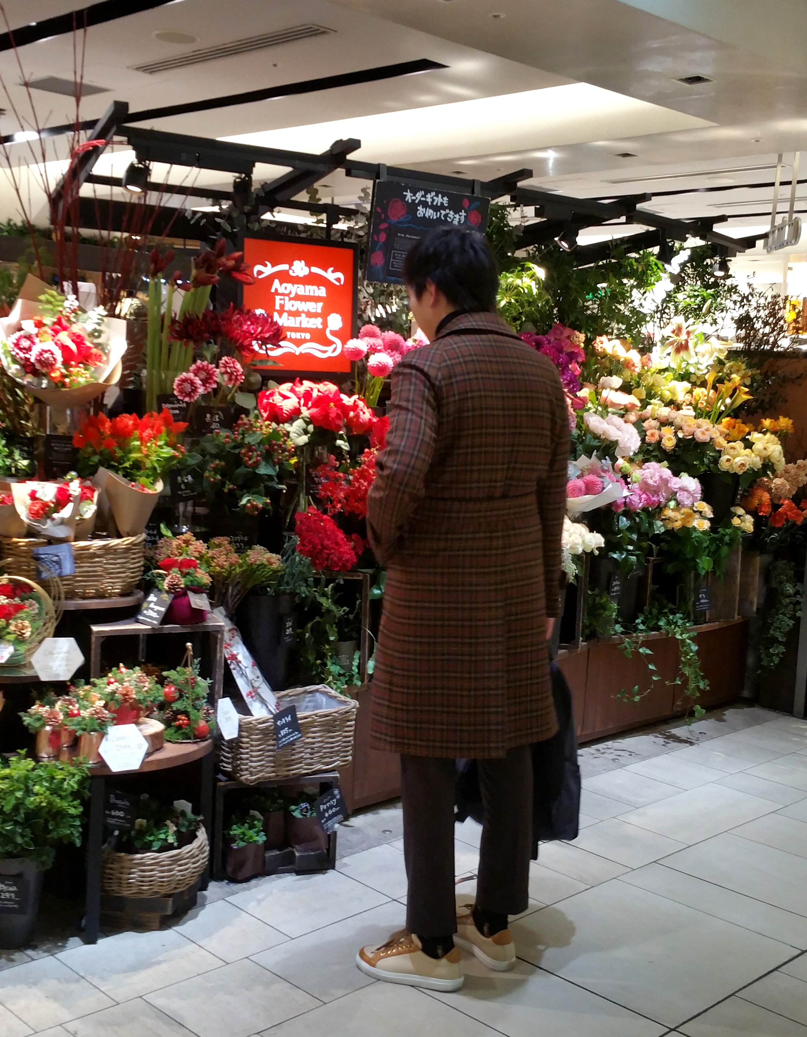 ここはパリの街角にある花屋さん...ではありません。品川駅にある商業施設、品川エキュート内の「青山フラワーマーケット」さんです。この日、昨日のことですが、21時37分の新幹線ひかりに乗るまでの時間を楽しみます。弁当を選ぶのも、いつもこの場所です。お土産を買う為に別れたジュニアを見つけたのは、この花屋さんの前。花も素敵ですが、彼の装いにも目が行きます。行き交う女性たちだけではなく、男性の視線も集めていたこのコートは、TAGLIATORE(タリアトーレ)のものですが、彼が購入を決めていたのは、ちょうど一年前の展示会の際でした。さすが、ぶれませんね。