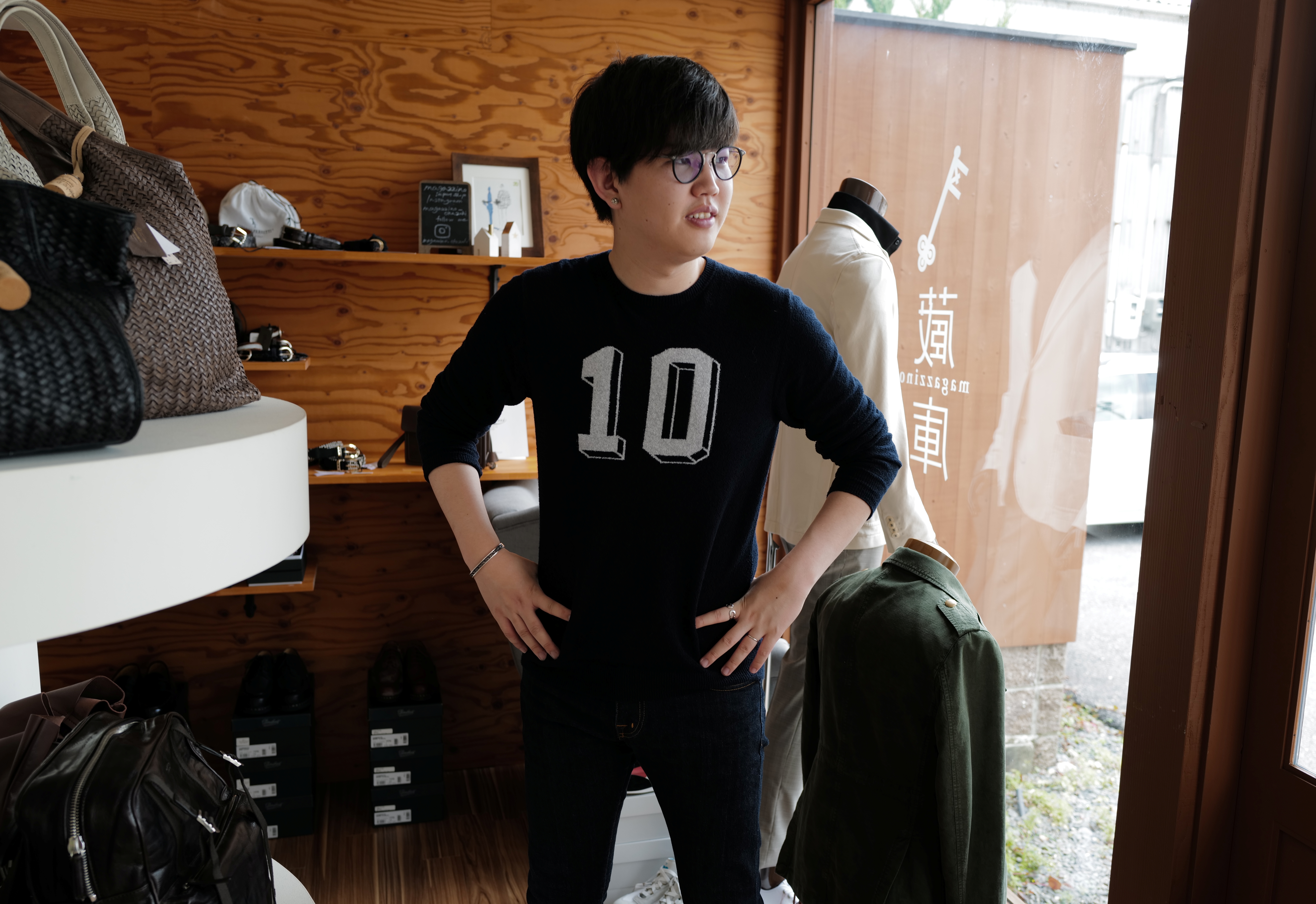 写真を撮っていて気が付いたのは、三人の服装が揃って、ネイビーであること。最近のブラックやブラウン、ベージュ人気の影に隠れている定番色ですが、肩の力を抜きたい時につい選んでしまうのが、着慣れたネイビー。来年の復活カラーと勝手に決め付けていますが、マリンティスとのアイテムが数多く提案されている来春夏の展示会を見ていると、満更、あてずっぽうな読みではありません。マイサイズがなく、無理やり小さめに着ているのが、L.B.M. 1911/エルビーエムのジャケット。価格を見て、びっくり。責任者の私が驚いていても仕方ありませんが、二人に任せ、あまり関知しない私にとっては、魅力的な商品。これもあれもと、ご案内したくなりましが、そろそろ移動の準備です。