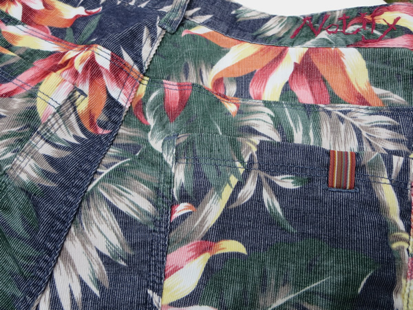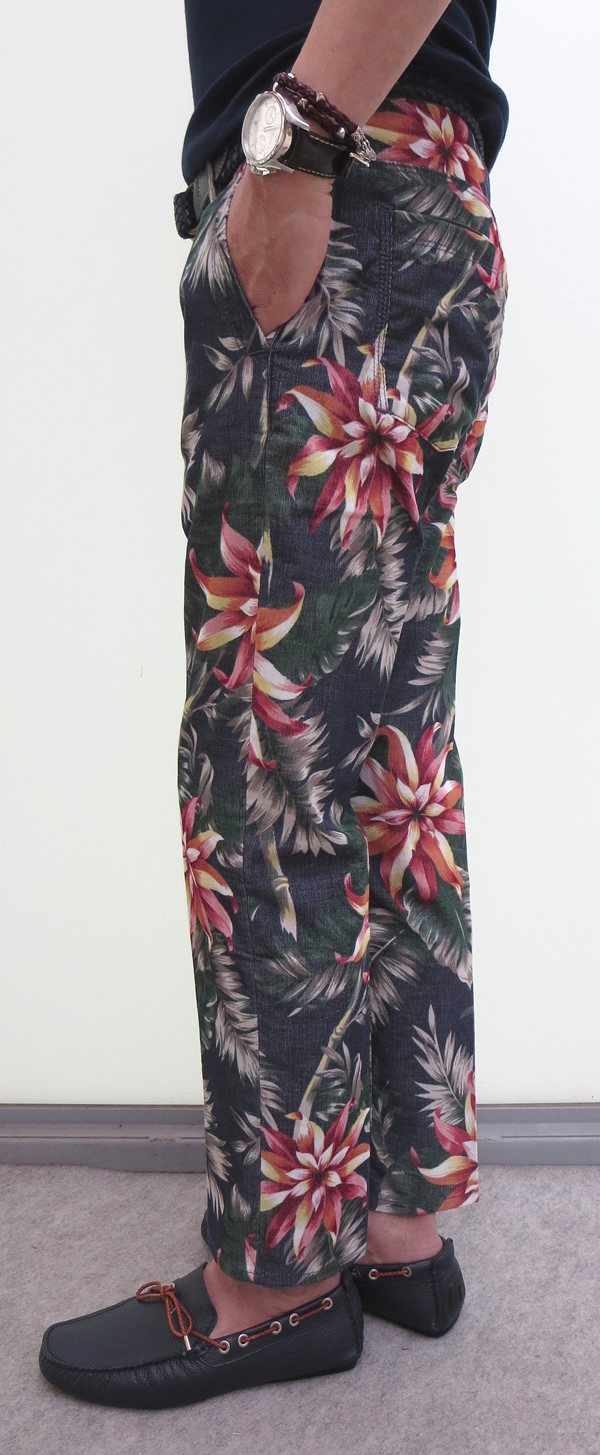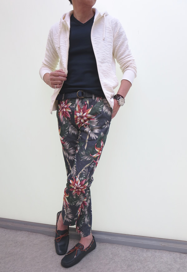 春を通り越して、サマーシーズンに合いそうなコーディネートです。トロピカルなモチーフのパンツは、「GINKO」のプリーツ入り(2P)のクロップド。もう一折して穿けば、更に気分。さらに折れば、もう、そこはリゾート地です。