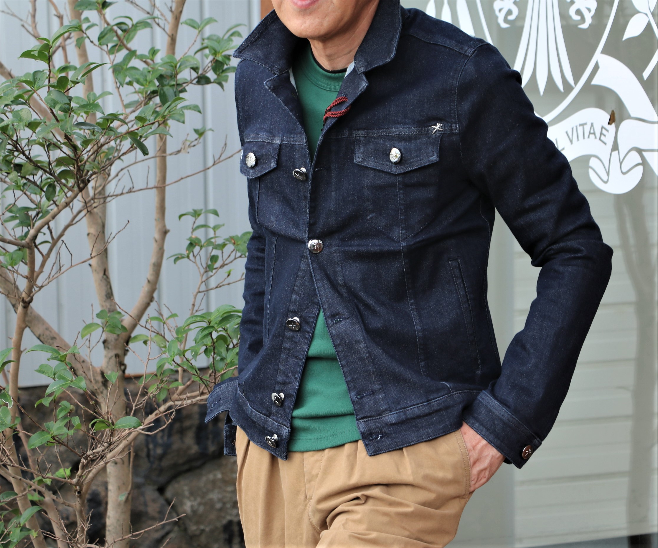 全く売れなかったザノーネのVベスト。グレイの他にネイビーも持っているドライコットンの気持ちの良いベストです。初夏の爽やかな季節にはちょうど良いアイテムですが、不思議と販売に苦労しました。グリーンの46が残り1点。これを購入すれば、全色揃うことに...なんて、思っていたら、既に完売でした。話が脱線。いや続けましょう。穿いているのはワンウォッシュぐらいのデニムらしいジーンズ。最近、カシェートで展開しているAVN(エーブイエヌ)がいい感じです。特に「Semi Slim」ワンウォッシュセルビッチデニムは購入予定です。白のオックスフォードクロスのB.Dシャツ(GUY ROVER/ギ・ローバー)を合わせるのが気分。そうなるとジャケットはネイビー?いや、今はブラックが良さそうです。ただ夏だから、クラシックすぎないラフなジャケットを選びたい...